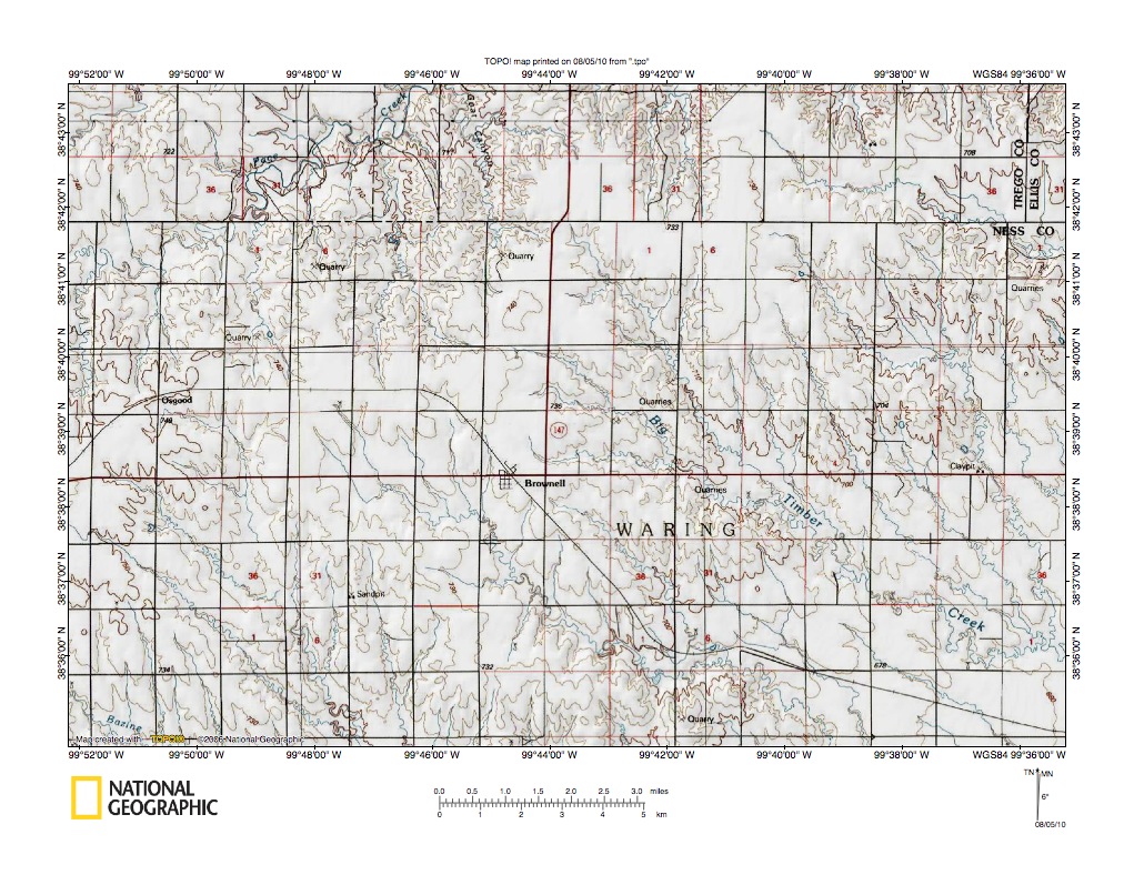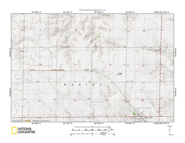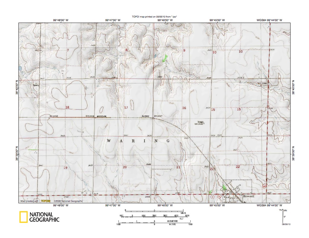 Figure 10: Detailed map of Page Creek-Big Timber Creek drainage divide area north of Brownell, Kansas. United States Geological Survey map digitally presented using National Geographic Society TOPO software.