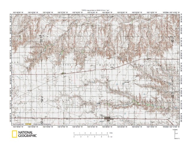 Figure 4: Smoky Hill River-Walnut Creek drainage divide area near Pendennis, Kansas. United States Geological Survey map digitally presented using National Geographic Society TOPO software.