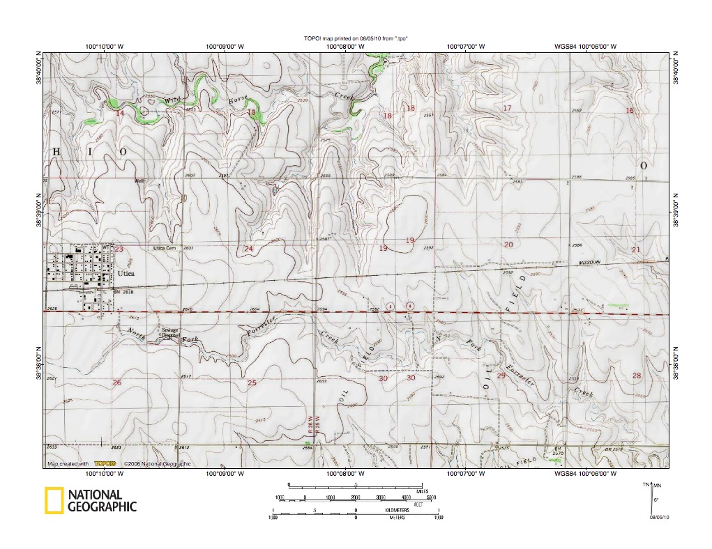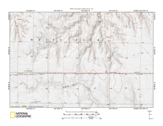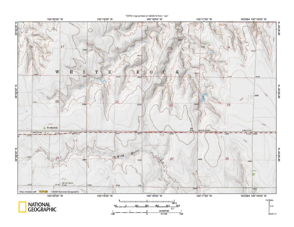 Figure 5: Detailed map of Smoky Hill River-Wild Horse Creek drainage divide area near Pendennis, Kansas. United States Geological Survey map digitally presented using National Geographic Society TOPO software.