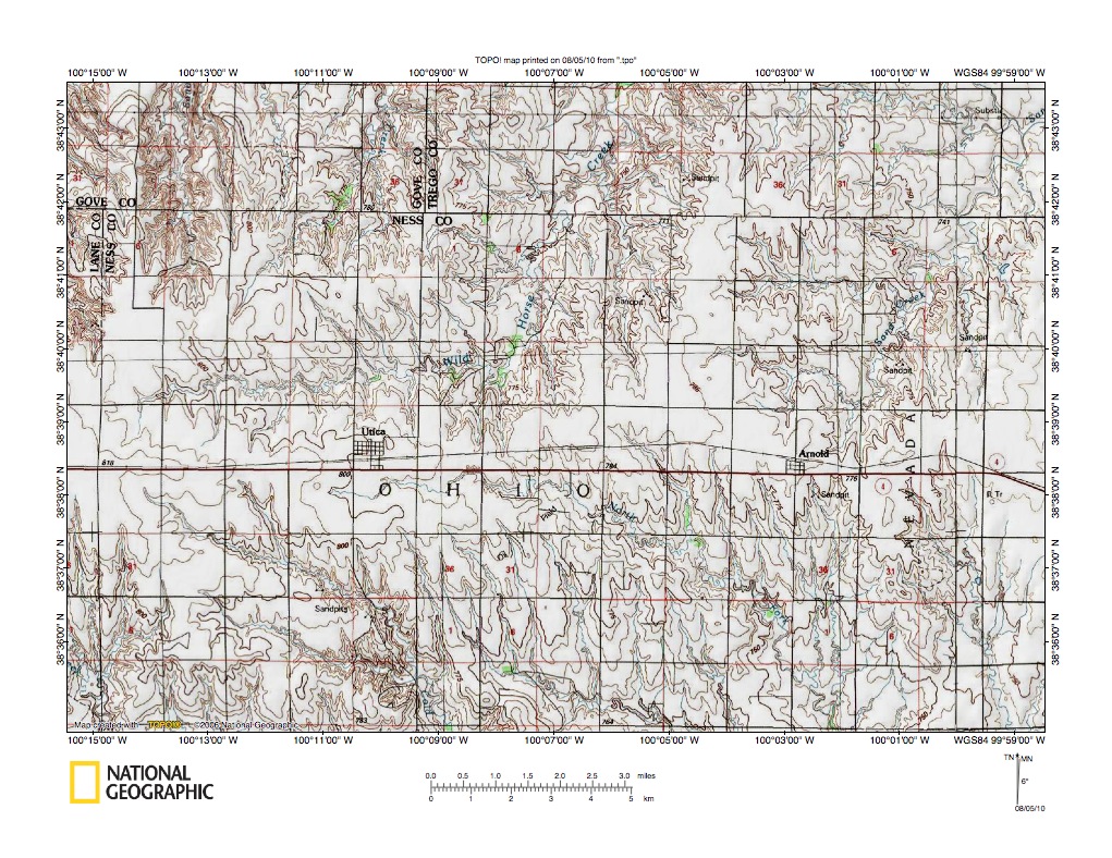 Figure 8a: Smoky Hill River-Walnut Creek drainage divide area near Ransom, Kansas. United States Geological Survey map digitally presented using National Geographic Society TOPO software.
