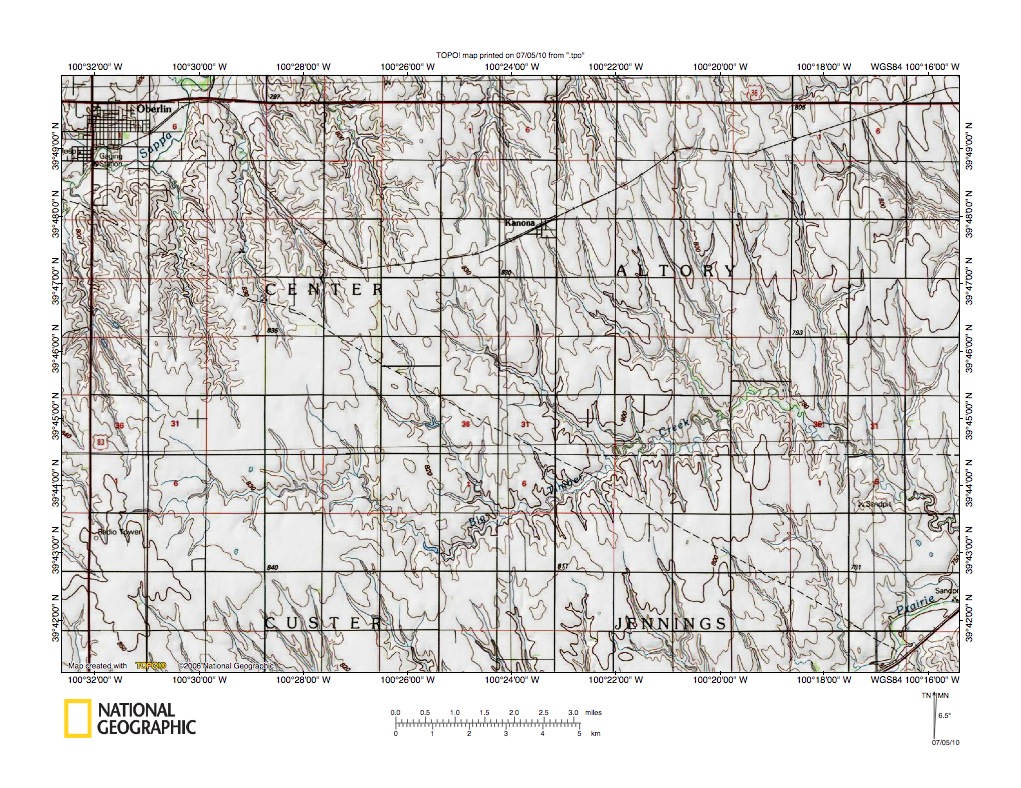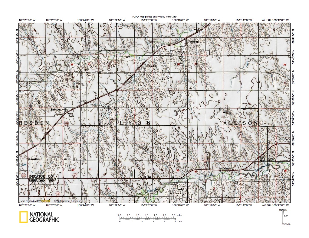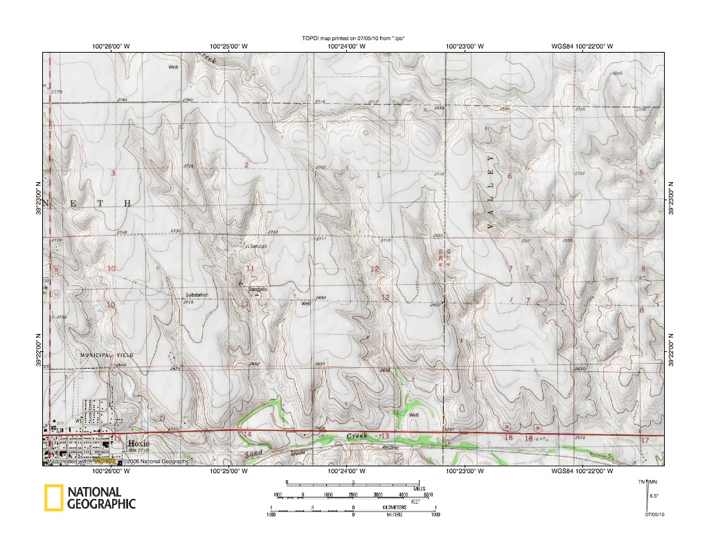 Figure 5: Sappa Creek-Prairie Dog Creek drainage divide area. United States Geological Survey map digitally presented using National Geographic Society TOPO software.