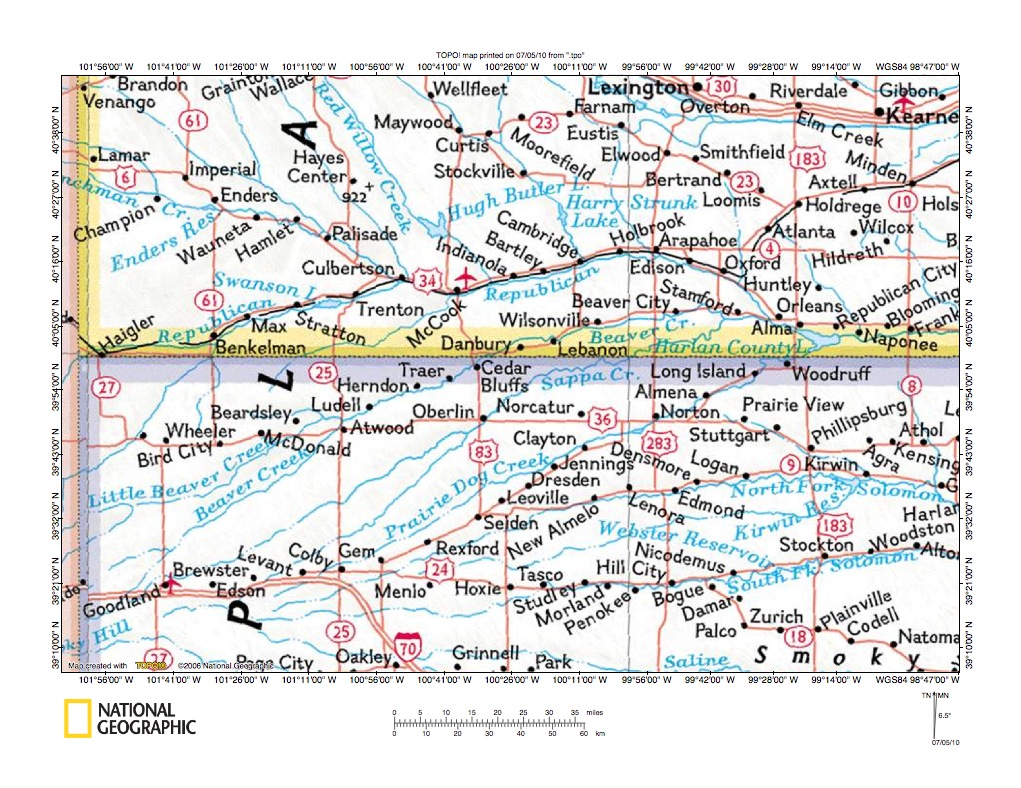 Figure 1: Beaver Creek-South Fork Solomon River drainage divide area location map (select and click on maps to enlarge). National Geographic Society map digitally presented using National Geographic Society TOPO software.