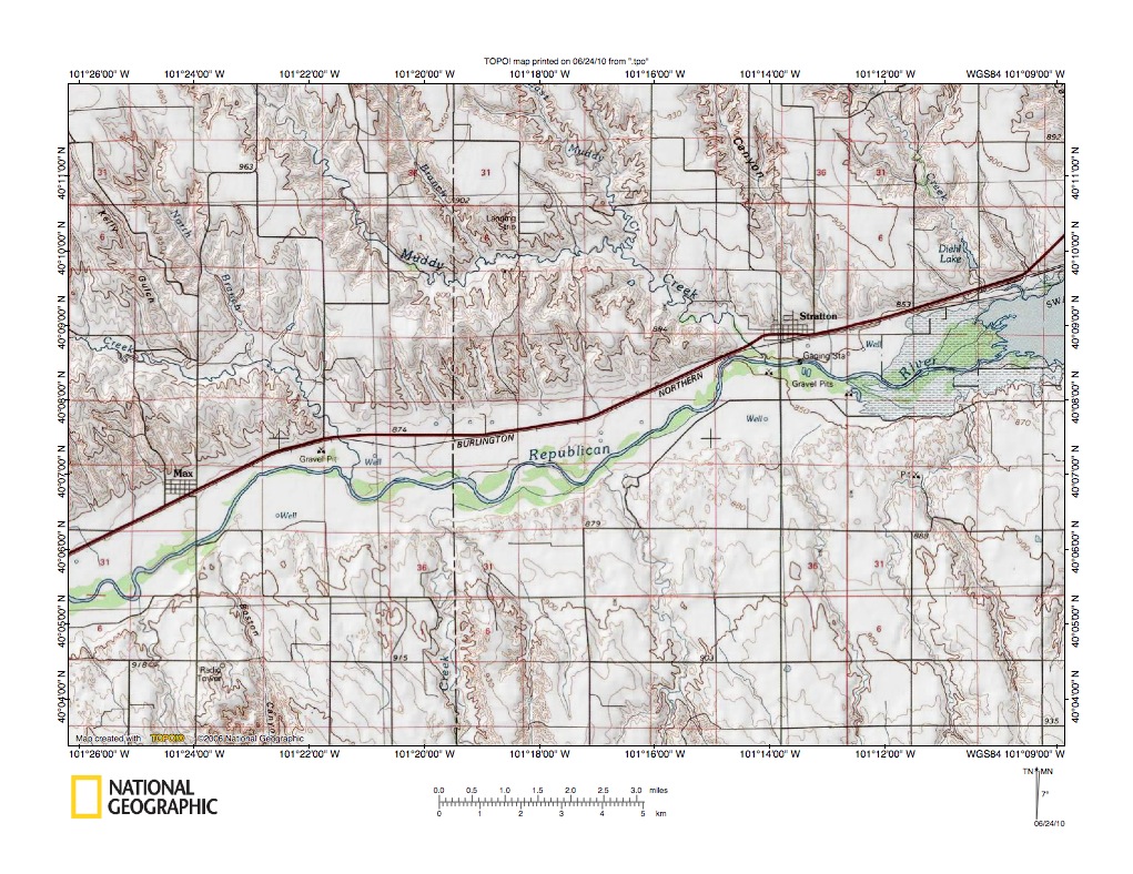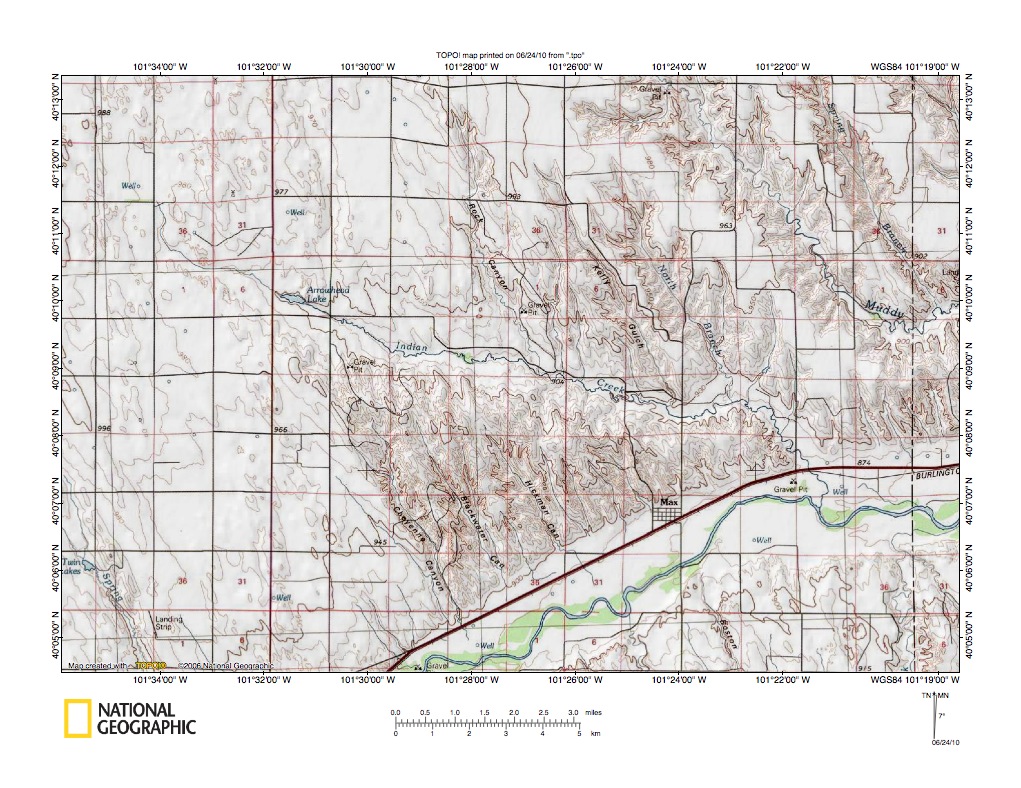 Figure 10: Detailed map of Indian Creek-Republican River drainage divide area. United States Geological Survey map digitally presented using National Geographic Society TOPO software.