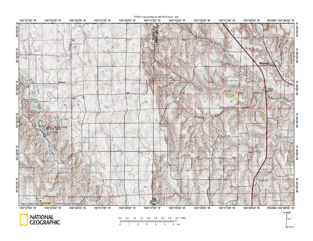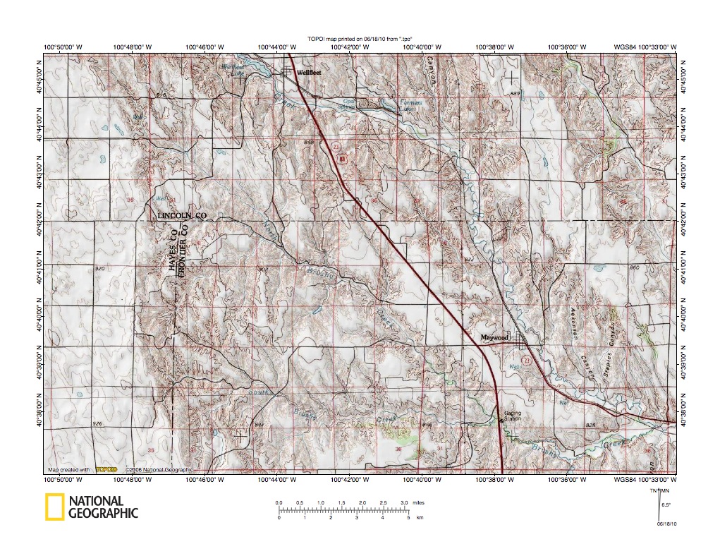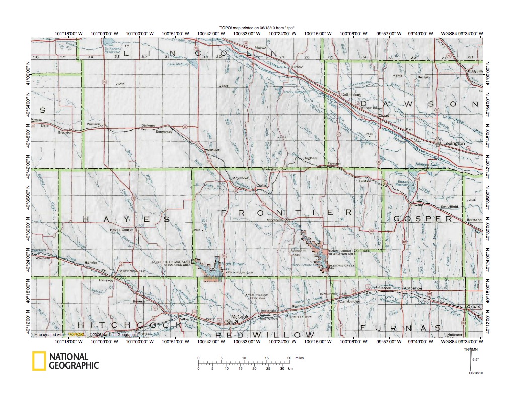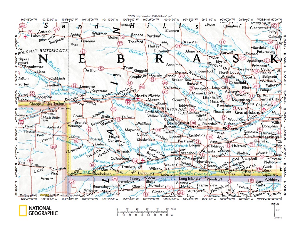 Figure 1: Medicine Creek-Red Willow Creek drainage divide area location map (select and click on maps to enlarge). National Geographic Society map digitally presented using National Geographic Society TOPO software.