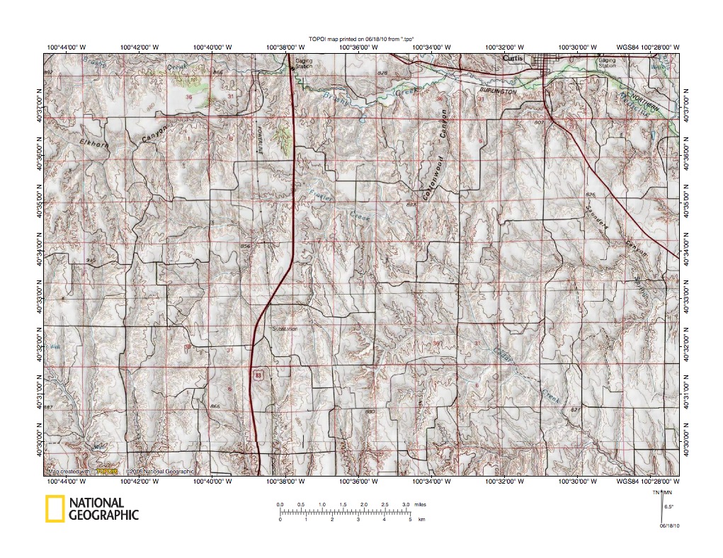 Figure 3: Northwest end of Medicine Creek-Red Willow Creek drainage divide area. United States Geological Survey map digitally presented using National Geographic Society TOPO software.