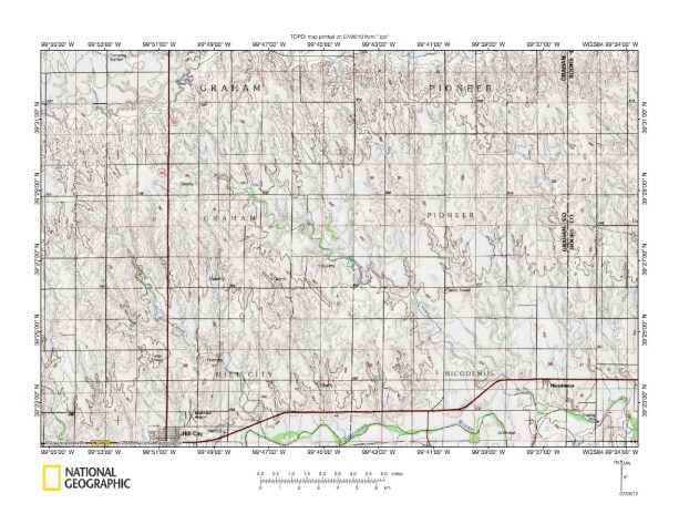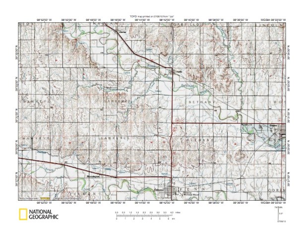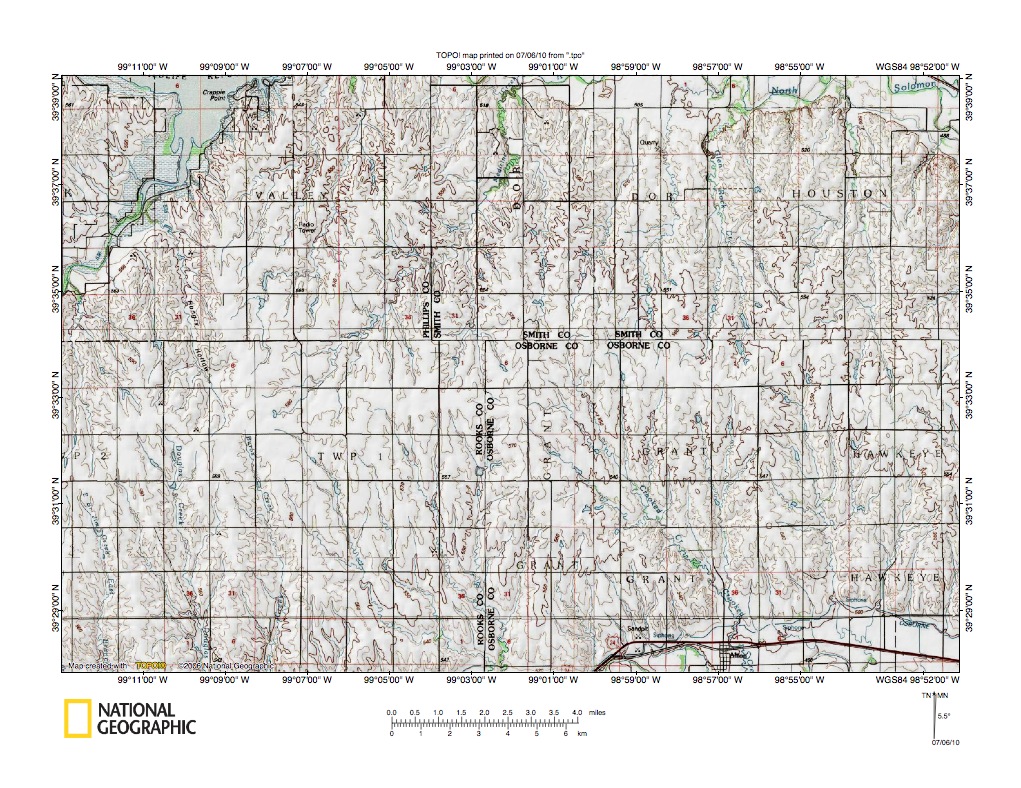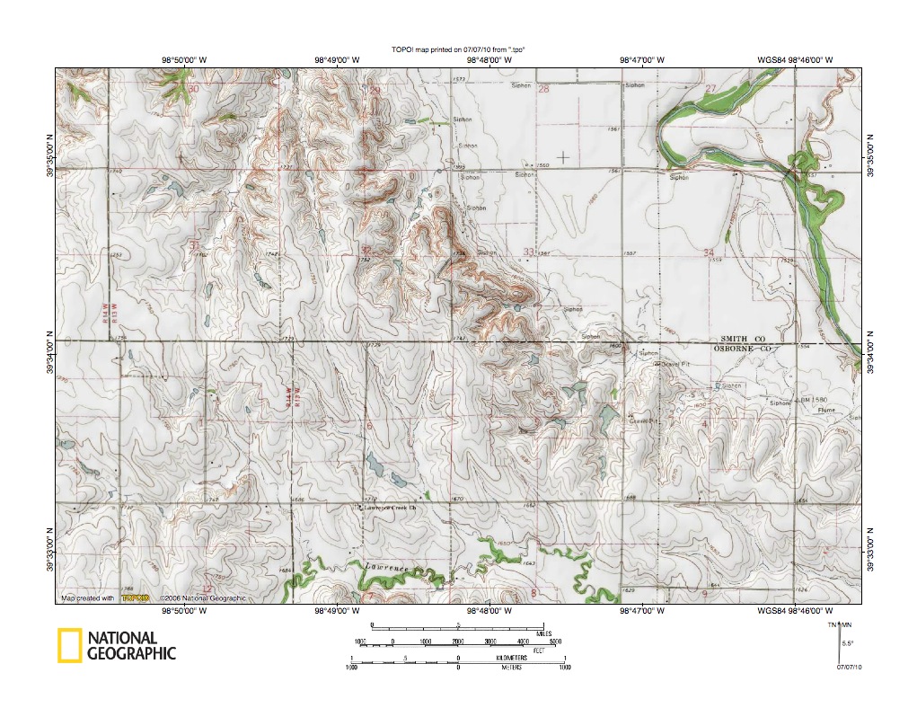 Figure 7: North Fork Solomon River-Bow Creek drainage divide area southeast of Logan. United States Geological Survey map digitally presented using National Geographic Society TOPO software.