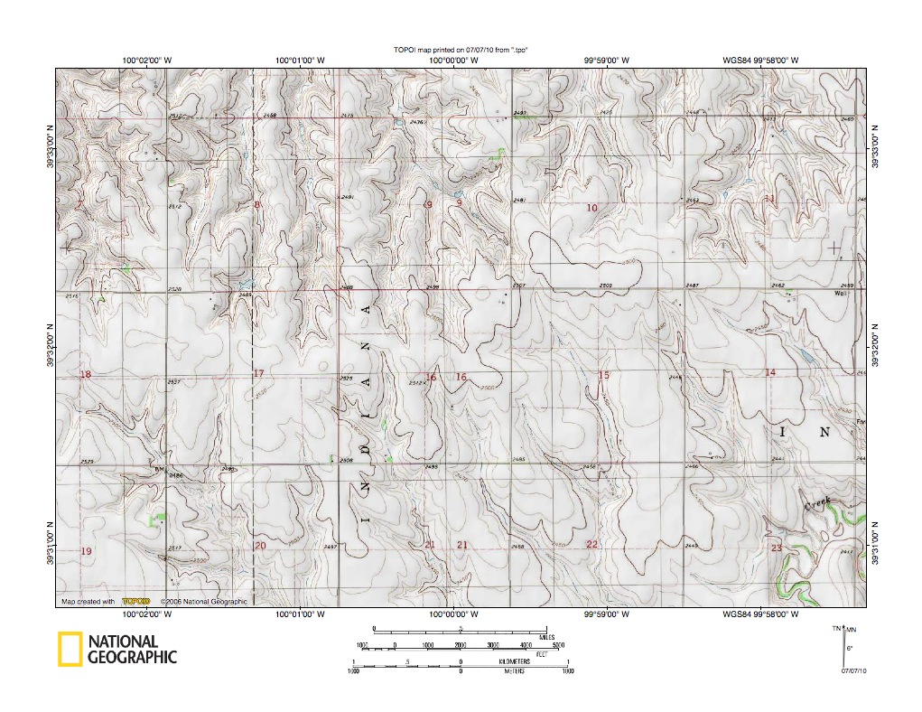 Figure 3: North Fork Solomon River-Bow Creek drainage divide area south of Lenora. United States Geological Survey map digitally presented using National Geographic Society TOPO software.