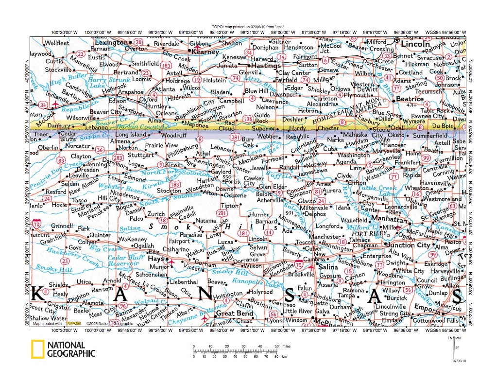 Figure 1: North Fork Solomon River-South Fork Solomon River drainage divide area location map (select and click on maps to enlarge). National Geographic Society map digitally presented using National Geographic Society TOPO software.
