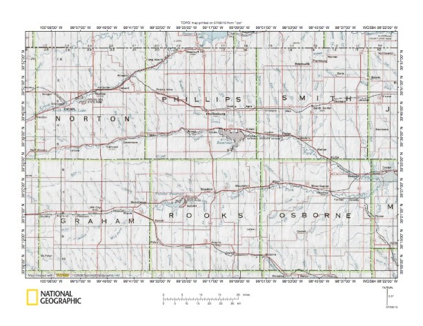 Figure 8: Bow Creek-South Fork Solomon River drainage divide area north of Stockton. United States Geological Survey map digitally presented using National Geographic Society TOPO software.