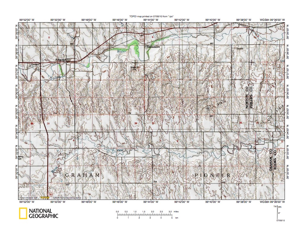 Figure 4: Bow Creek-South Fork Solomon River drainage divide area north of Morland. United States Geological Survey map digitally presented using National Geographic Society TOPO software.