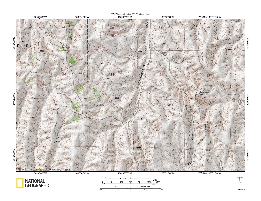 - Figure 6 provides a detailed map of the Cottonwood Canyon-Fox Creek drainage divide area located east of the figure 5 map area and includes overlap areas with figure 5. Cottonwood Canyon drains in a north-northeast and north direction from the figure 6 center to the figure 6 north center edge. Note how in section 30 the north oriented Cottonwood Creek valley has captured southeast oriented drainage from a valley draining from the section 24 northeast quadrant across the section 19 southwest quadrant to the section 30 northeast quadrant. That capture occurred at the time south oriented flood flow across the figure 6 map area was reversed by Platte River valley headward erosion north of the figure 6 map area. Note how in the section 30 southwest corner there is a through valley linking the north oriented Cottonwood Canyon valley with headwaters of a southwest and south oriented valley. That south oriented valley is a Cut Canyon tributary and was eroded headward by south oriented flood flow moving south on the present day north-oriented Cottonwood Canyon alignment and also moving southeast on the alignment of the southeast-oriented Cottonwood Canyon headwaters valley. Also note the north oriented Cottonwood Canyon headwaters valley in the section 29 southwest corner and how that north oriented valley is linked by a through valley near the figure 6 south edge with a south oriented valley. The south oriented valley is a Fox Creek tributary. South-oriented Fox Creek is labeled in the figure 6 southeast quadrant and is a Medicine Creek tributary. Note how in section 20 the Fox Creek headwaters are linked by a through valley with a northwest-oriented Cottonwood Canyon tributary. Prior to Platte River valley headward erosion south oriented flood flow moved south from the Cottonwood Canyon alignment to what was then the actively eroding Fox Creek valley. When Platte River valley headward erosion beheaded south-oriented flood flow moving along the Cottonwood Canyon alignment, flood waters were reversed and the flow reversal eroded the northwest-oriented Cottonwood Canyon tributary valley. Note how the early flood flow channels were diverging and merging, which is characteristic of an anastomosing channel complex. This entire badland area along the Platte River-Medicine Creek drainage divide was crossed by a south-oriented anastomosing channel complex, into which deep south-oriented Medicine Creek tributary valleys eroded headward from the newly eroded Medicine Creek valley. At that time the Platte River valley did not exist and flood water were flowing on a high level topographic surface at least as high the highest figure 6 elevations today. Then Platte River valley headward erosion beheaded the south-oriented flood flow channels (one channel at a time from east to west) and flood waters on north ends of beheaded flood flow channels reversed flow direction to flow north to the newly eroded Platte River valley. Because flood flow channels were interconnected reversed flood flow on a newly beheaded flood flow channel could capture yet to be beheaded flood flow from channels further to the west. Capture of such yet to be beheaded flood flow provided the water volumes required to deep north-oriented Platte River tributary valleys.