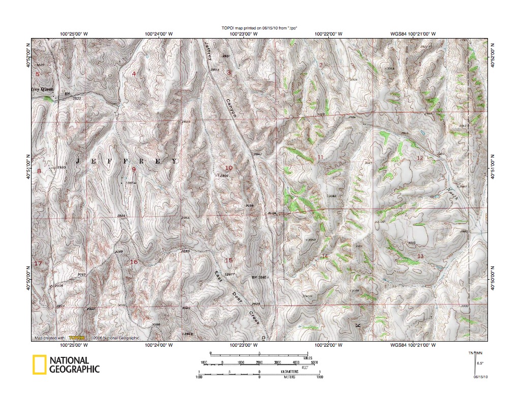 - Figure 8 provides a detailed map of the Jeffery Canyon-East Deer Creek Canyon drainage divide area located east and south of the figure 7 map area and includes overlap areas with figure 7. North-northwest oriented Jeffery Canyon is labeled and is located in the figure 8 center area and extends from the figure 8 south center to the figure 8 north edge. South-southeast oriented East Deer Creek Canyon drains to the figure 8 south center edge. South of figure 8 Deer Creek flows in a south-southeast direction to join the east and southeast oriented Republican River and is not a Medicine Creek tributary. Note how in the figure 8 south center area a south oriented East Deer Creek Canyon tributary is linked by a north-south through valley with the north-northwest oriented Jeffery Canyon valley. Other through valleys in sections 9 and 16 link north- and northeast-oriented Jeffery Canyon tributary valleys with headwaters of the south-southeast-oriented East Deer Creek Canyon valley. These and other figure 8 through valleys provide evidence of major south oriented flood flow channels, which carried large quantities of south oriented flood water to what was then the actively eroding East Deer Creek Canyon valley. These flood flow channels were eroded at a time when the Platte River valley north of the figure 8 map area did not exist. South-oriented flood waters had been captured by headward erosion of the east and southeast oriented Republican River valley located south and east of the figure 8 map area. The deep (East) Deer Creek Canyon valley then eroded headward from the newly eroded Republican River valley north wall along south-oriented anastomosing flood flow channels and into and north of the figure 8 map area. Headward erosion of the southeast oriented Platte River valley north of the figure 8 map area then beheaded the south-oriented flood flow channels providing flood waters to what were then the south oriented East Deer Creek Canyon valley and tributary valleys. Flood waters on north ends of beheaded flood flow channels reversed flow direction to flow north to the newly eroded and deeper Platte River valley. The reversal of flood flow eroded the north-oriented Jeffery Canyon valley and tributary valleys and also captured yet to be beheaded flood flow from south-oriented flood flow channels further to the west (Snell Canyon for example). The flood flow reversal also created the Jeffery Canyon-East Deer Creek Canyon drainage divide. Headward erosion of the Platte River valley next beheaded south oriented flood flow channels further west, which had been supplying the newly reversed Jeffery Canyon valley with large volumes of yet to be beheaded flood flow. The figure 8 landscape has not significantly changed since all flood routes were beheaded.