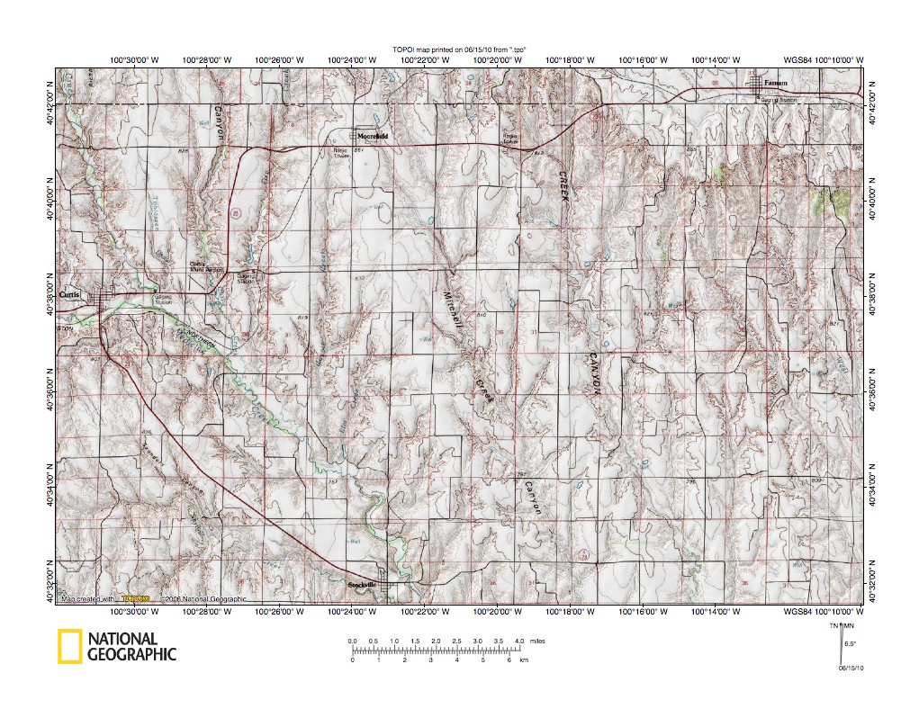 - Figure 9 illustrates the Medicine Creek valley between Curtis and Stockville and is located south of the figure 4 map area. Curtis is the town located near the figure 9 west center edge. Stockville is the town located just west of the figure 9 south center edge, Medicine Creek flows in a southeast direction from Curtis to Stockville and then to the figure 9 south edge. South of figure 9 Medicine Creek flows to the east and southeast oriented Republican River (see figure 10 below). Fox Creek is the south-southeast oriented stream flowing from the figure 9 northwest corner to join Medicine Creek near Curtis. Curtis Creek Canyon is the south oriented stream east of Fox Creek. Moorefeld is the town located west of the figure 9 north center area. Mitchell Creek Canyon is the south-southeast oriented stream originating near Moorefield and flowing across the figure 9 center to the figure 9 south edge. South of figure 9 Mitchell Creek Canyon joins southeast oriented Medicine Creek. East of Mitchell Creek Canyon is south-southeast oriented Deer Creek Canyon, which extends from the figure 9 north edge to the figure 9 south edge. South of figure 9 Deer Creek flows parallel to Medicine Creek and directly joins the east-oriented Republican River (see figure 10). Farnam is the town located in the figure 9 northeast corner area. Note how Farnam is located on what appears to be a high level erosion surface into which the south-southeast oriented Republican and Medicine Creek tributary drainage basins have been eroded. Note the south- and southwest-facing escarpment marking the south and southwest boundaries of that upland erosion surface. Note how the southwest facing escarpment is the south-southeast oriented Deer Creek valley wall. Figure 9a below illustrates the region north and east of Farnam, which is the Plum Creek-Platte River drainage divide area. Farnam is the town located in the figure 9a south center area. The southeast-oriented Platte River is located in the figure 9a northeast corner and is located in the large southeast-oriented Platte River valley. The southeast-oriented stream draining the upland erosion on which Farnam is located is Plum Creek. Plum Creek originates in the figure 9a northwest quadrant and flows to the figure 9a south edge (east half). South and east of figure 9a Plum Creek eventually joins the Platte River (Plum Creek downstream from figure 9a is illustrated and discussed in the Platte River-Republican drainage divide area in Gosper and Furnas Counties essay). The Plum Creek valley eroded headward from what was then the actively eroding Platte River valley head slightly in advance of Platte River valley headward erosion.Plum Creek valley headward erosion beheaded south-oriented flood flow channels to what were then actively eroding south-oriented Republican River tributary valleys and diverted flood water east to the newly eroded Platte River valley. Headward erosion of the East Deer Creek Canyon valley (extending in a south-southeast direction from the figure 9a northwest corner along the southwest margin of the Plum Creek drained upland erosion surface) to the figure 9a south edge beheaded some southeast-oriented flood flow routes to the Plum Creek valley. Headward erosion of the deeper Platte River valley eventually beheaded all south-oriented flood flow routes from the north, which were moving water to the actively eroding Plum Creek valley. North-oriented Platte River tributary valleys were eroded by reversal of flood flow on north ends of south-oriented flood flow channels.