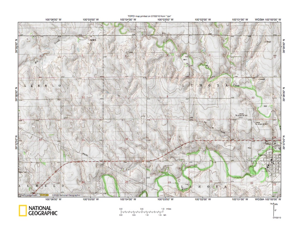 Figure 3: Prairie Dog Creek-North Fork Solomon River drainage divide area southeast from Woodruff, Kansas. United States Geological Survey map digitally presented using National Geographic Society TOPO software.