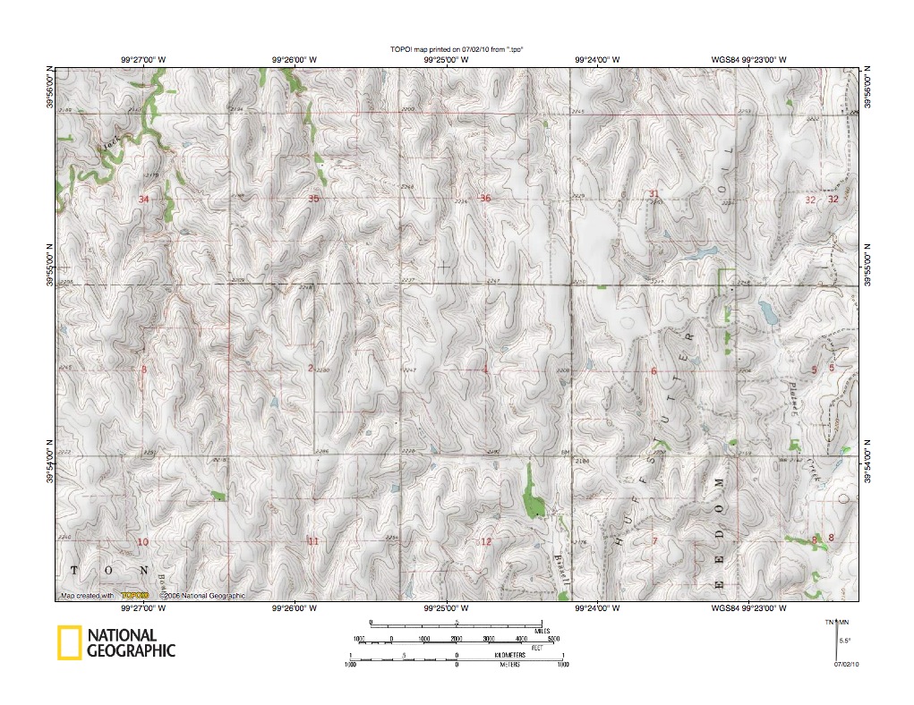 Figure 6: Deer Creek-North Fork Solomon River drainage divide area. United States Geological Survey map digitally presented using National Geographic Society TOPO software.
