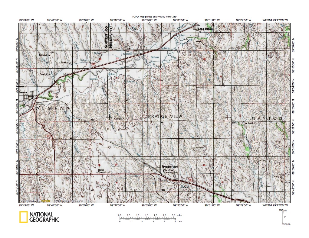 Figure 2: Prairie Dog Creek-North Fork Solomon River drainage divide area detailed location map. United States Geological Survey map digitally presented using National Geographic Society TOPO software.