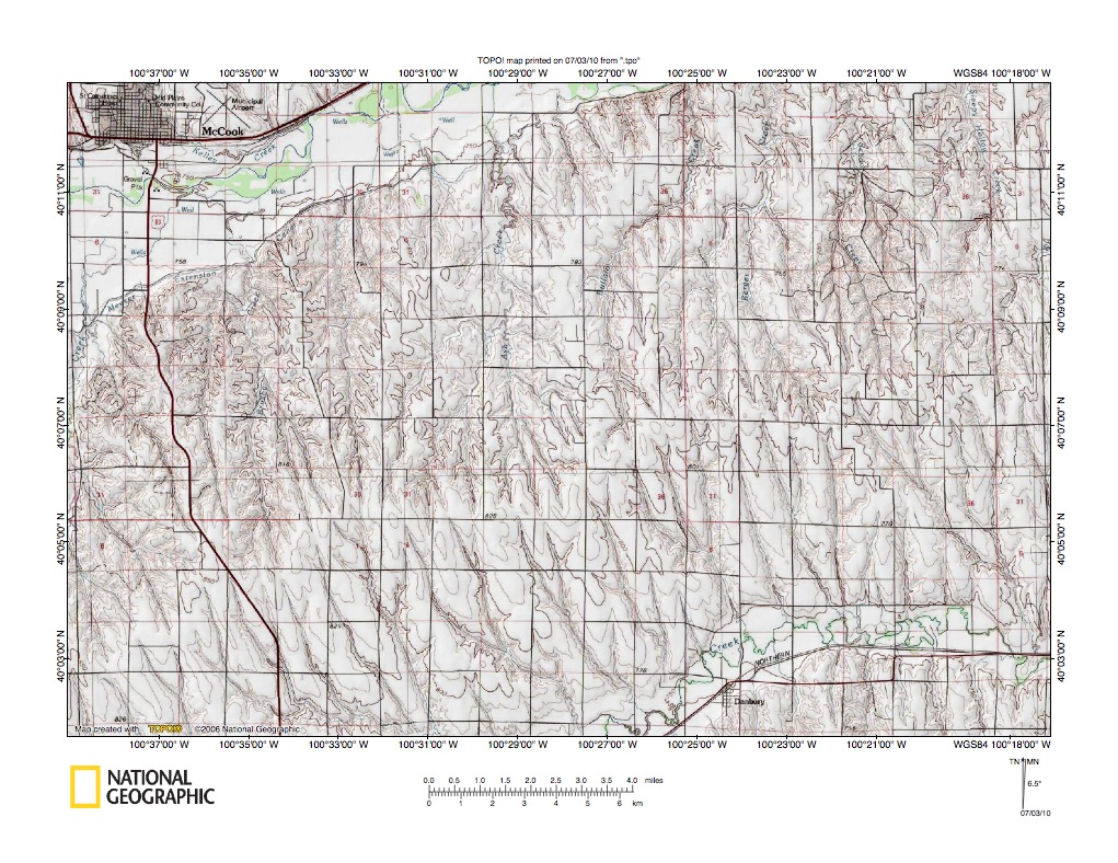Figure 4: Republican River-Beaver Creek drainage divide area south and east of McCook, Nebraska. United States Geological Survey map digitally presented using National Geographic Society TOPO software.