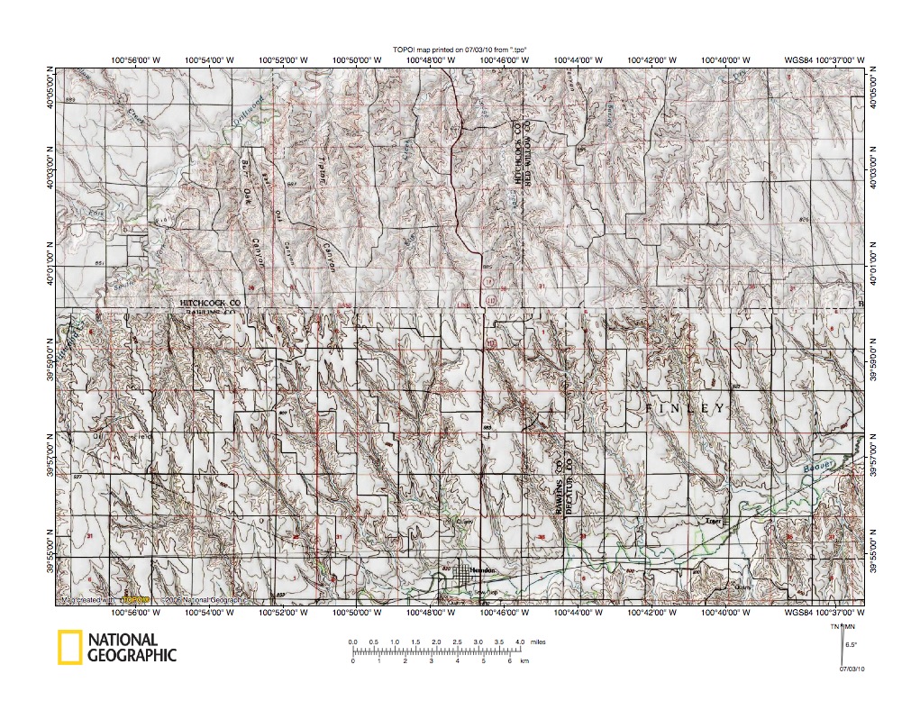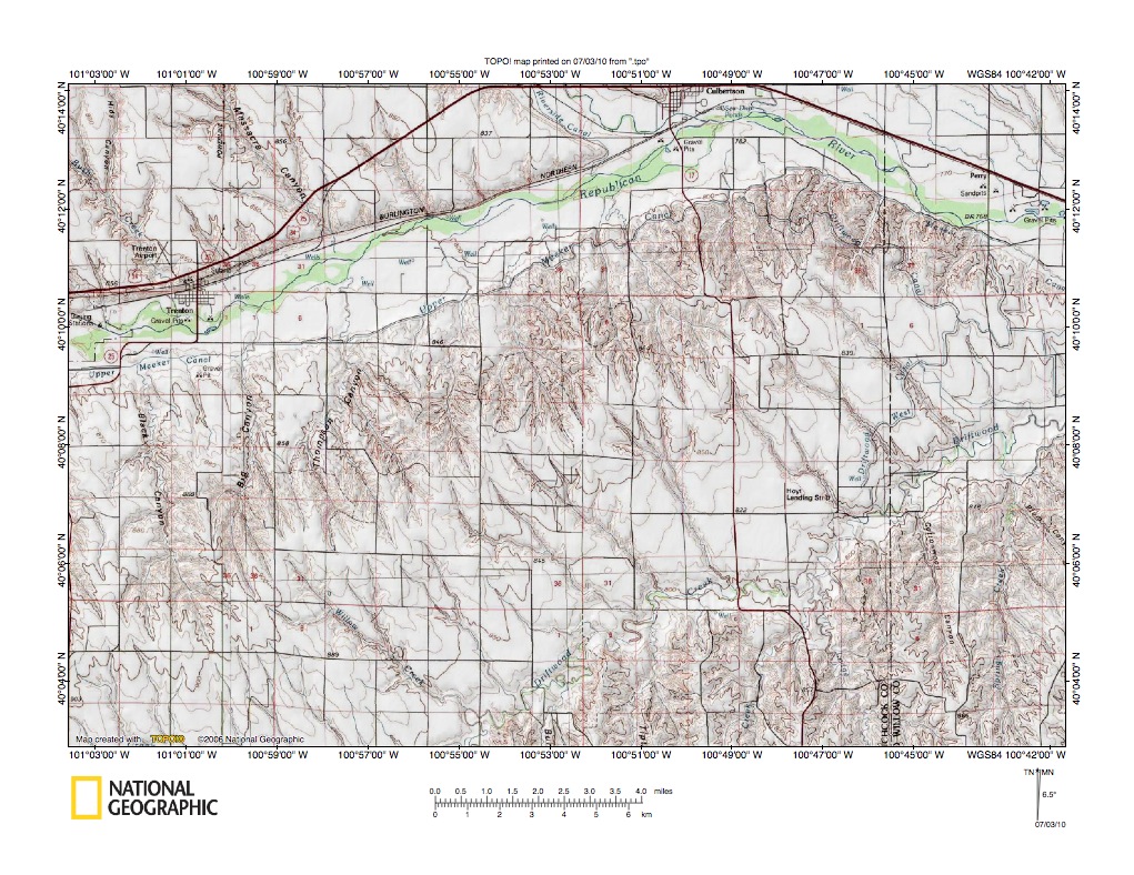 Figure 3: Republican River-Beaver Creek drainage divide area in eastern Red Willow County. United States Geological Survey map digitally presented using National Geographic Society TOPO software.