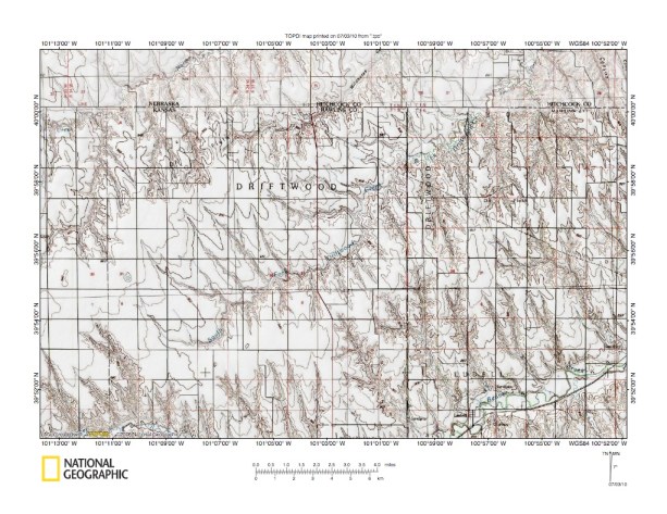 Figure 6: Republican River-Driftwood Creek drainage divide area. United States Geological Survey map digitally presented using National Geographic Society TOPO software.