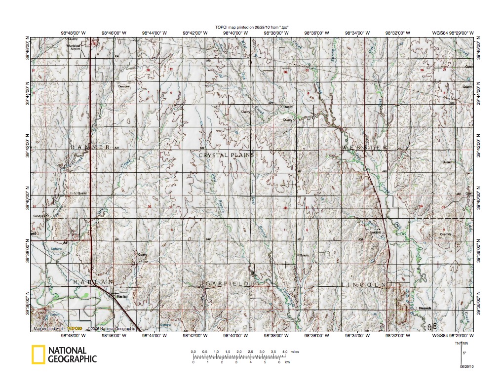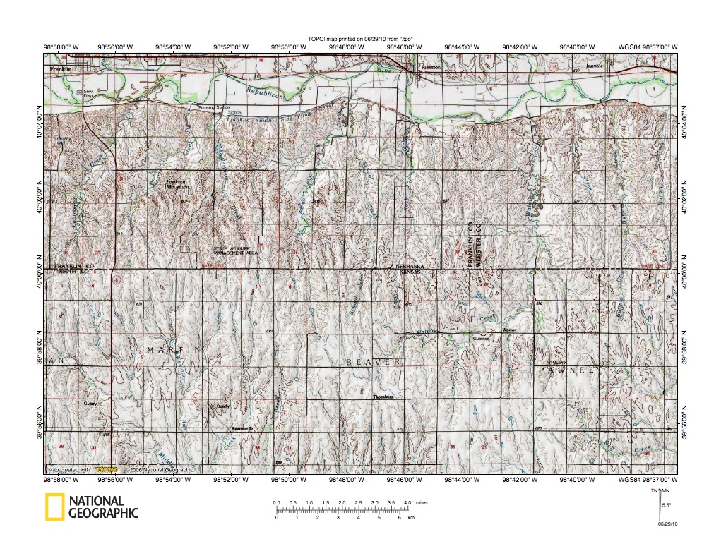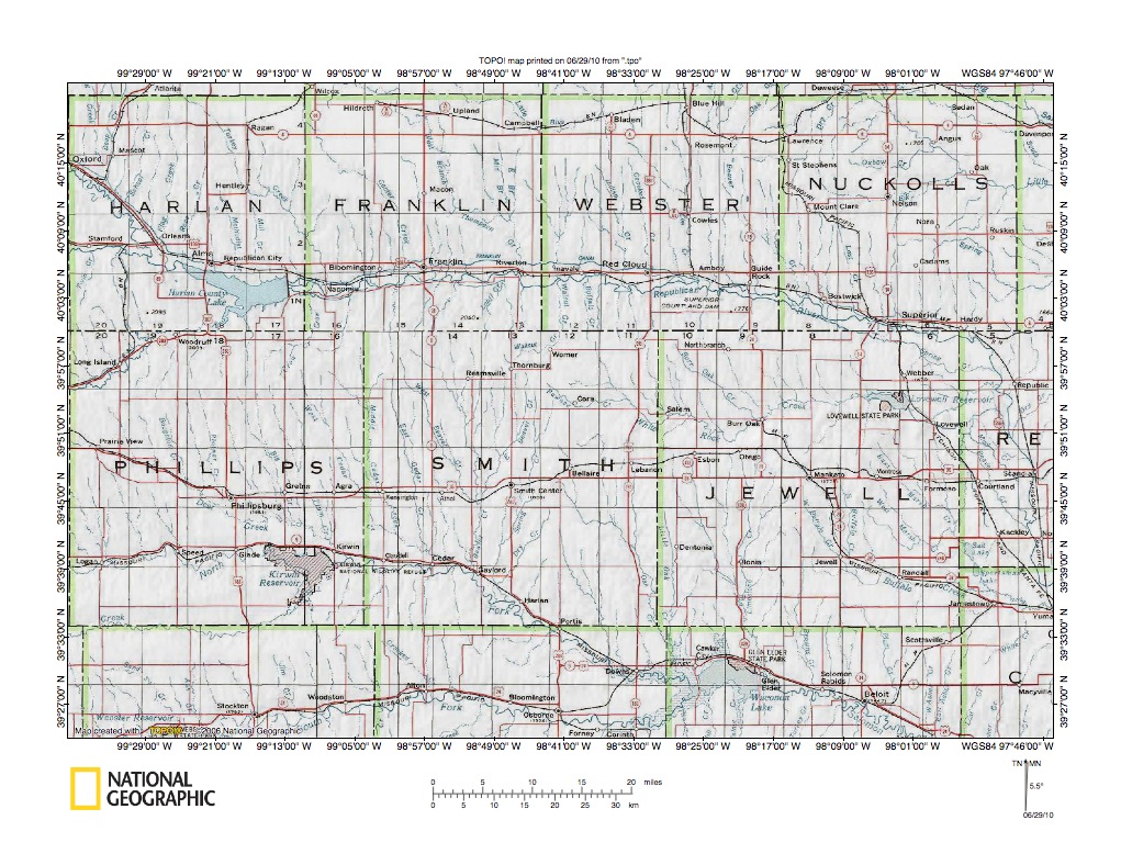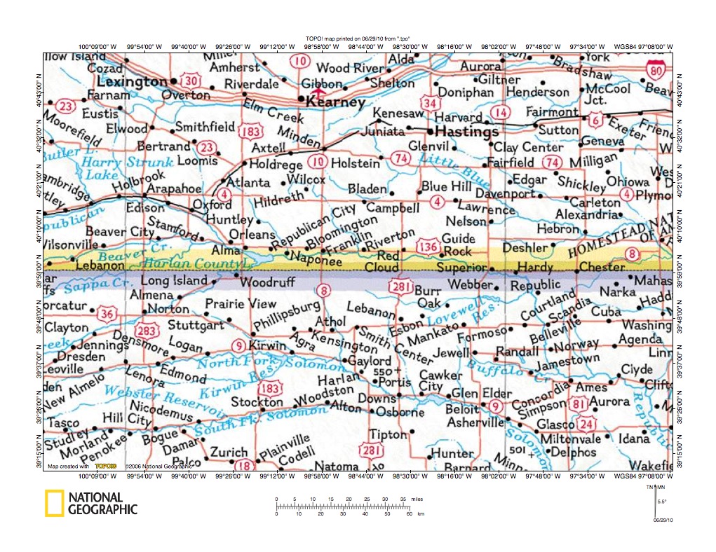Figure 1: Republican River-North Fork Solomon River drainage divide area location map (select and click on maps to enlarge). National Geographic Society map digitally presented using National Geographic Society TOPO software.