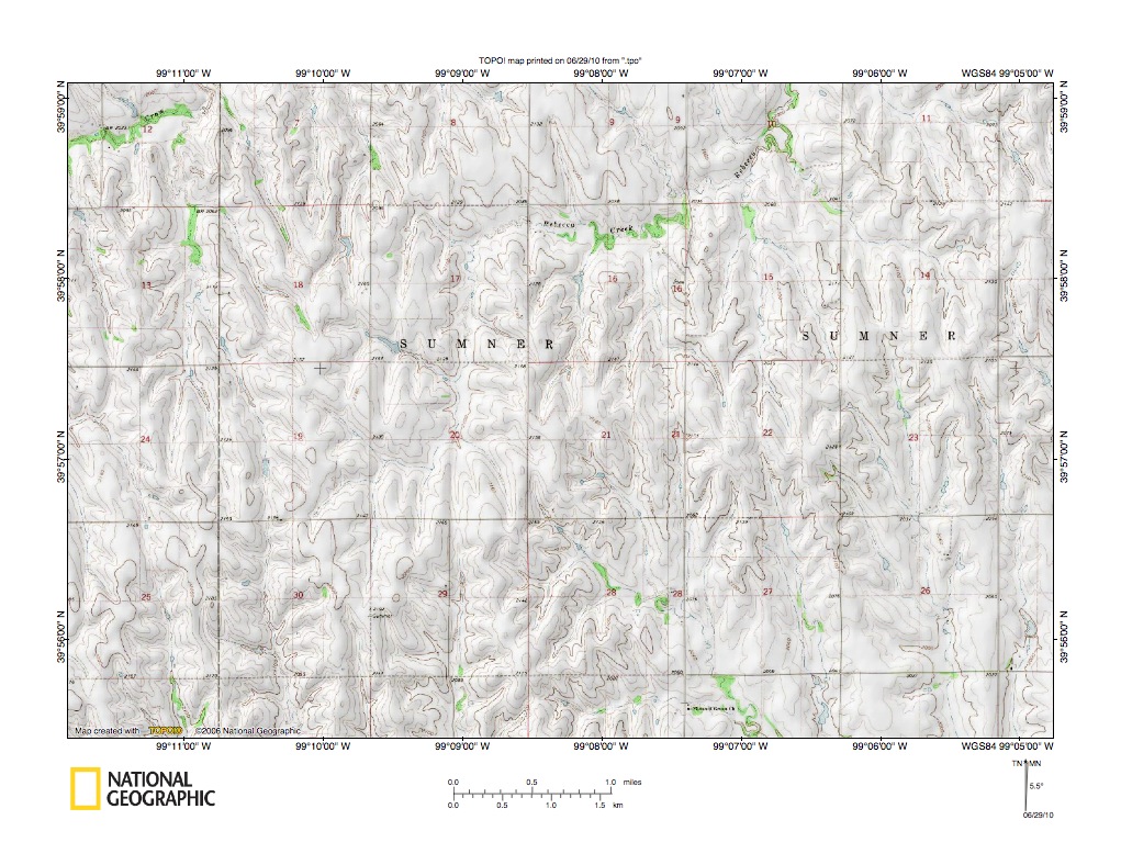 Figure 7 illustrates the Rebecca Creek-Cedar Creek (Republican River-North Fork Solomon River) drainage divide west of the figure 5 map area and includes overlap areas with figure 5. Harlan County Lake is the reservoir located behind the dam in the figure 7 northwest corner. The Republican River flows in an east direction from Harlan County Lake to the figure 7 northeast corner. Naponee is the town located in the figure 7 northwest quadrant downstream from the Harlan County Dam. The south edge of Franklin can be seen along the figure 7 north edge (in the northeast quadrant). The west to east oriented state line separates the figure 7 north half (Nebraska) from the figure 7 south half (Kansas). Named north-oriented Republican River tributaries from east to west are Wortham Creek, Reams Creek, Calumet Creek (south of Franklin), Lost Creek, Lochite Creek, Rebecca Creek, and Crow Creek. South-oriented drainage in the figure 7 southeast quadrant flows to south-oriented Beaver Creek, which flows to the North Fork Solomon River. South-oriented drainage near the north-south Phillips-Smith County line (just west of the figure 7 south center area) flows to south-oriented Cedar Creek, which is another North Fork Solomon River tributary. A close look at the figure 7 Republican River-North Fork Solomon River drainage divide reveals shallow north-south oriented through valleys linking the north-oriented Republican River tributary valleys with the south-oriented North Fork Solomon River tributary valleys. The through valleys are further evidence of a south-oriented anastomosing channel complex that once moved flood waters from north of the figure 7 map area to what were then actively eroding south-oriented North Fork Solomon River tributary valleys. The south-oriented valleys eroded headward from what was then the newly eroded and deep North Fork Solomon River valley. At that time the deep east-oriented Republican River valley did not exist and elevations north of the present day Republican River-North Fork Solomon River drainage divide were at least as high as the present day drainage divide elevation. Republican River valley headward erosion then deeply eroded the region north of the drainage divide and beheaded in sequence from east to west the south-oriented flood flow channels. Flood waters on north ends of beheaded flood flow channels reversed flow direction to erode north-oriented Republican River tributary valleys and create the Republican River-North Fork Solomon River drainage divide. Figure 8 provides a detailed map of the Rebecca Creek-West Cedar Creek drainage divide area located in SUMNER township.