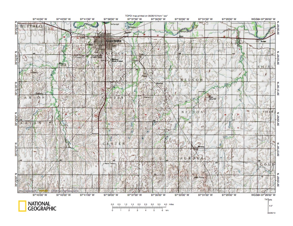 Figure 1: Republican River-Solomon River drainage divide area location map (select and click on maps to enlarge). National Geographic Society map digitally presented using National Geographic Society TOPO software.