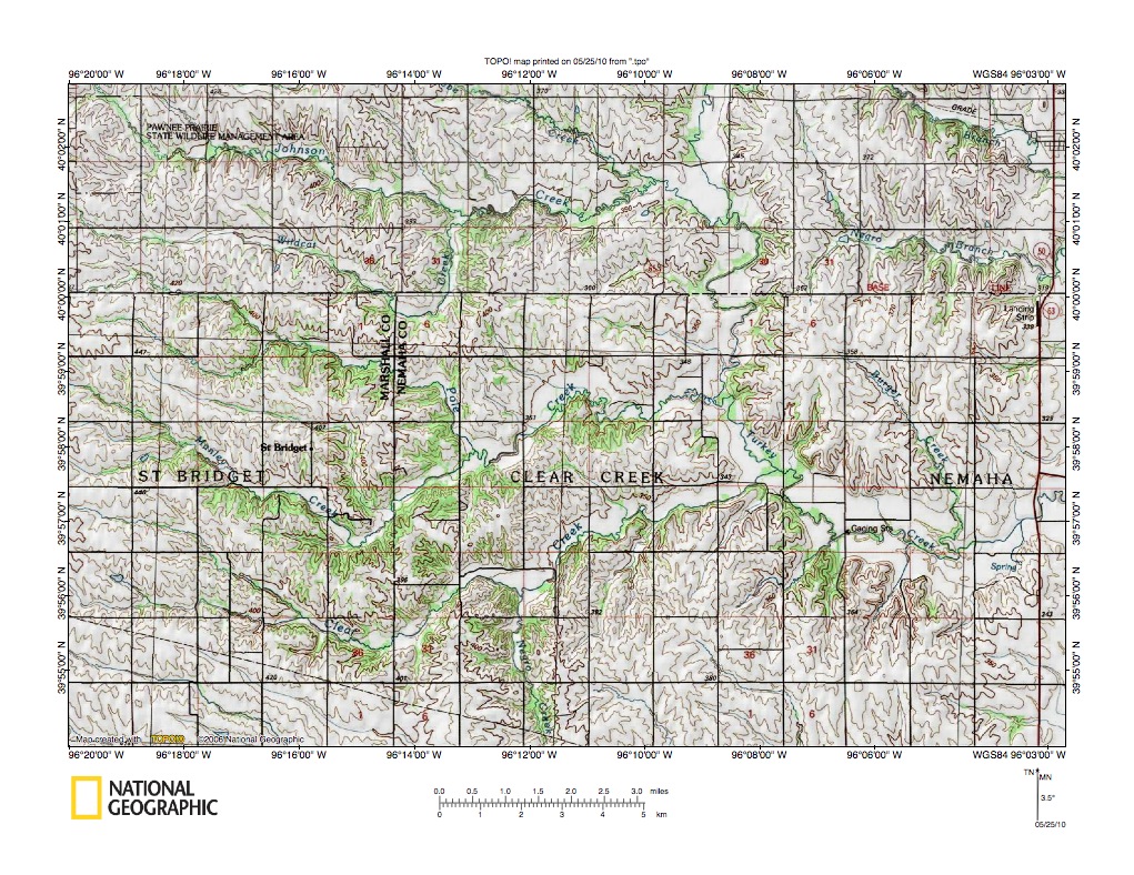 Figure 8: Detailed map of South Fork Big Nemaha River-Vermillion Creek drainage divide area. United States Geological Survey map digitally presented using National Geographic Society TOPO software.