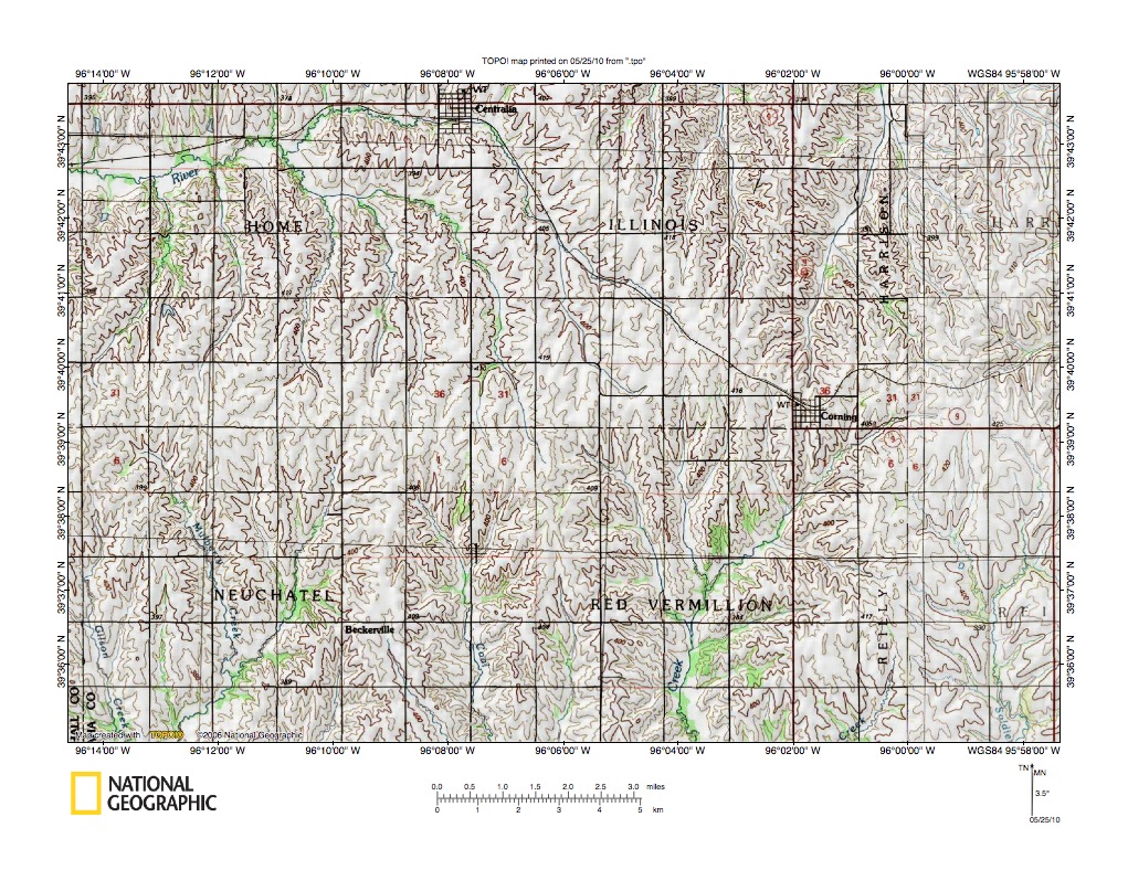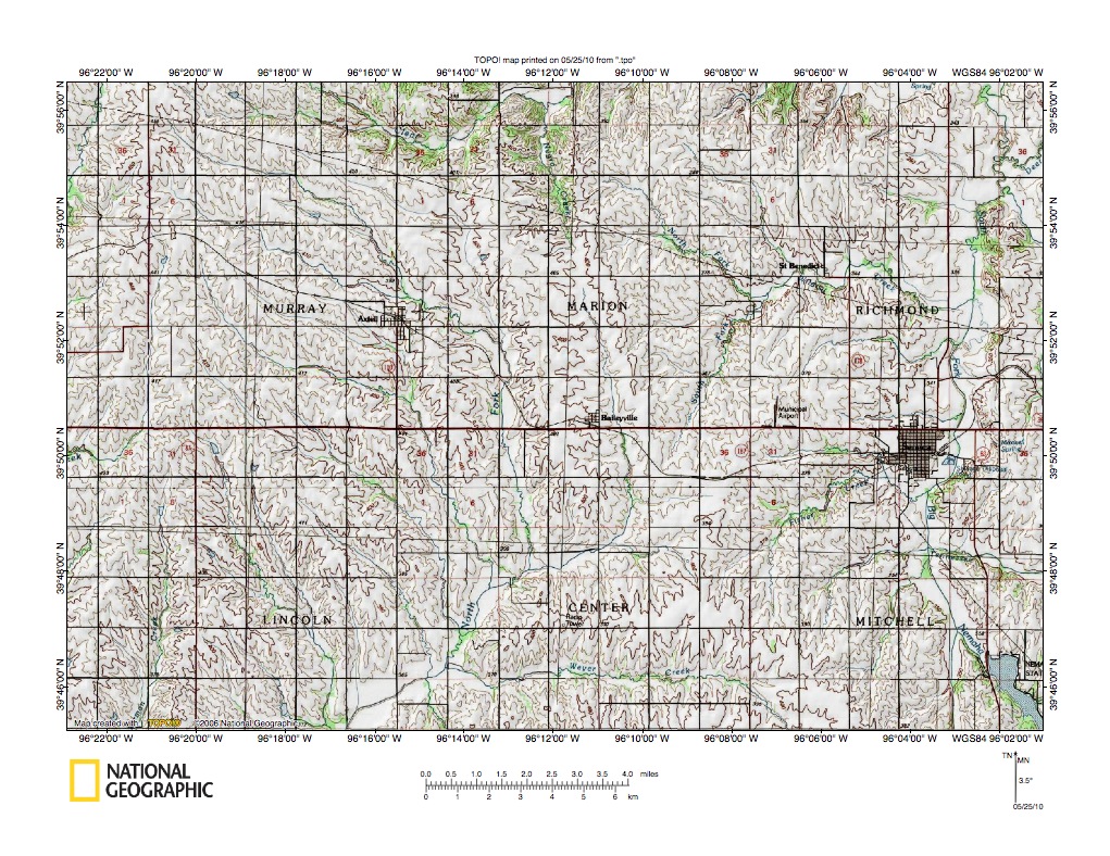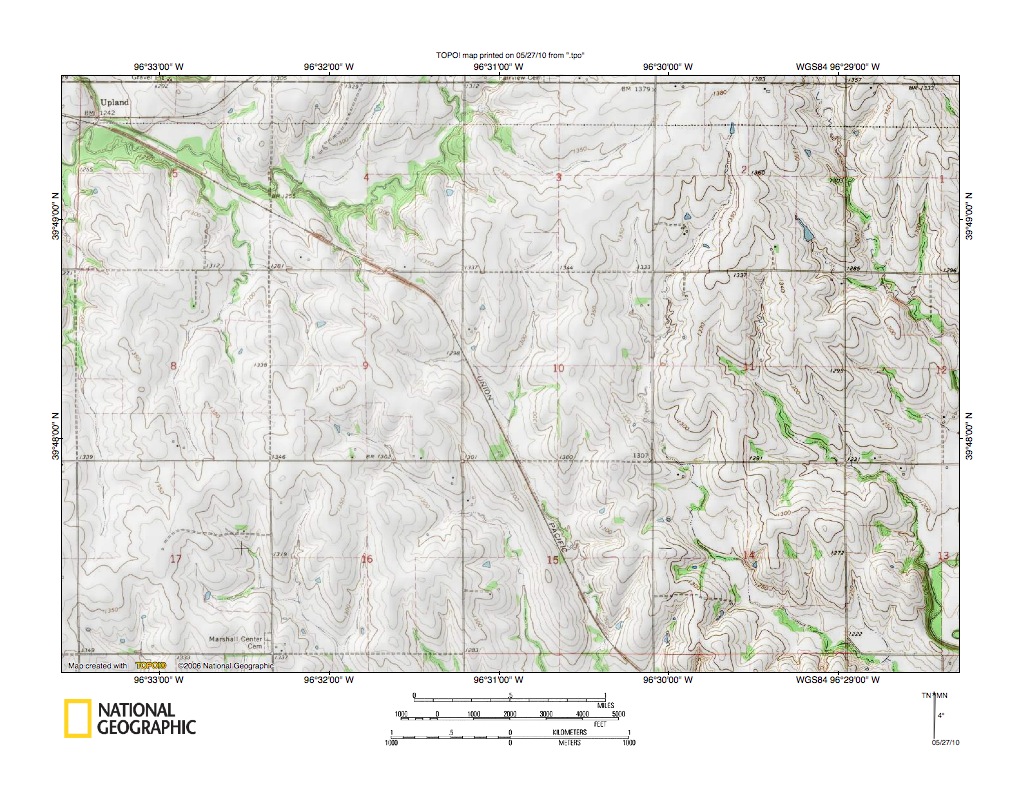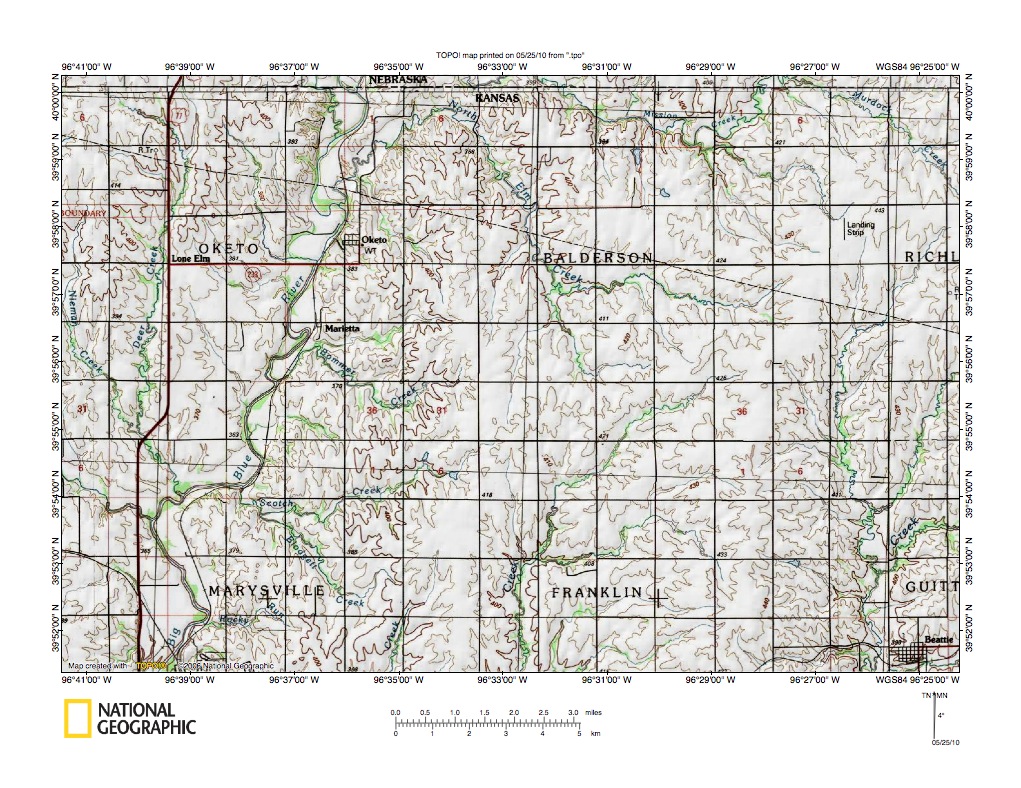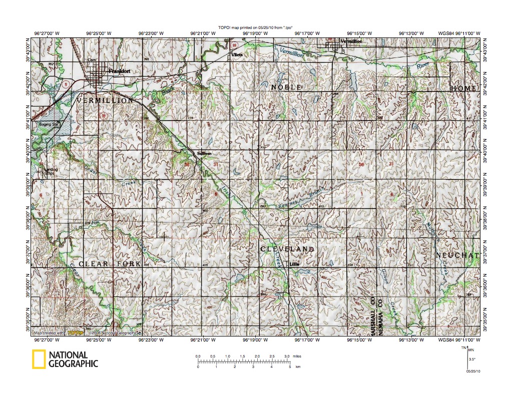 Figure 9: South Fork Big Nemaha River-North Fork Black Vermillion River drainage divide area. United States Geological Survey map digitally presented using National Geographic Society TOPO software.