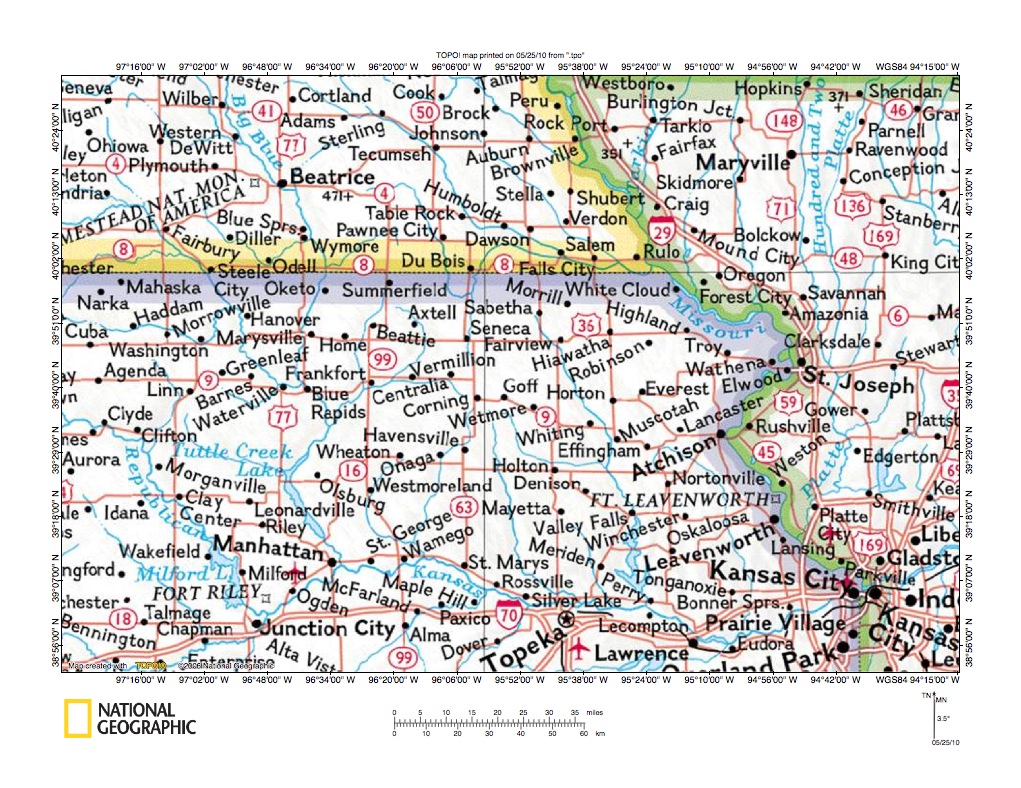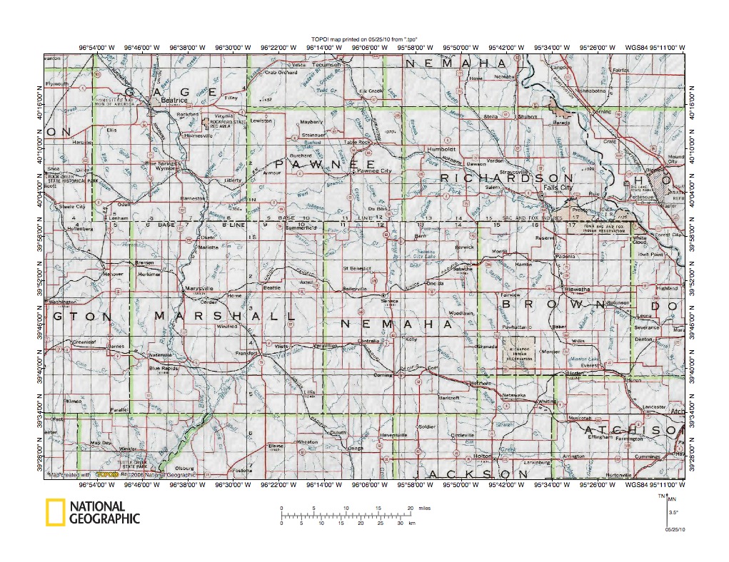 Figure 1: Big Blue River-South Fork Big Nemaha River drainage divide area location map (select and click on maps to enlarge). National Geographic Society map digitally presented using National Geographic Society TOPO software.
