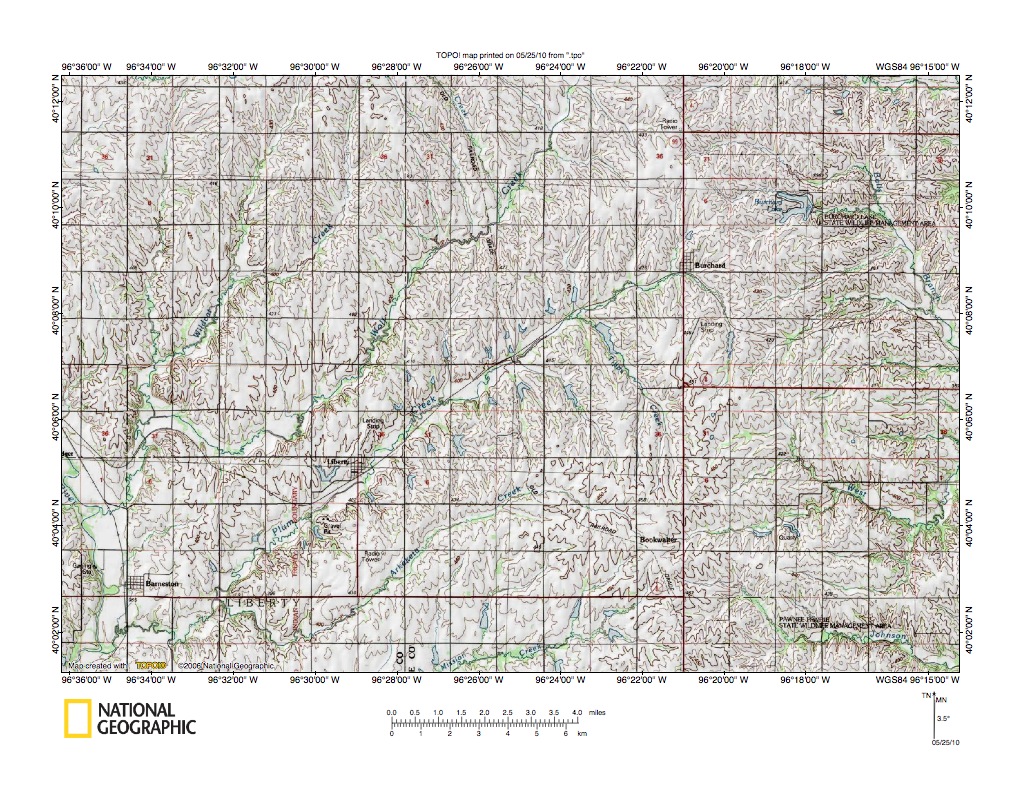 Figure 2: Big Blue River-South Fork Big Nemaha River drainage divide area detailed location map. United States Geological Survey map digitally presented using National Geographic Society TOPO software.