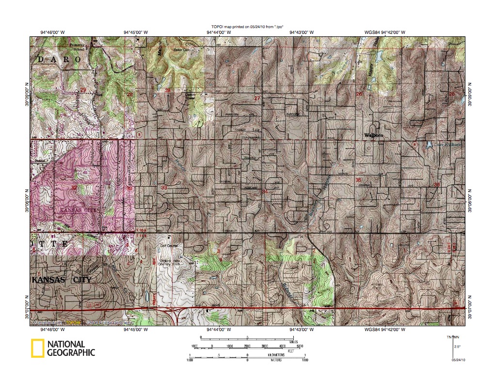 Figure 9a: Detailed map of Missouri River-Kansas River drainage divide area in western Kansas City, Kansas. United States Geological Survey map digitally presented using National Geographic Society TOPO software.