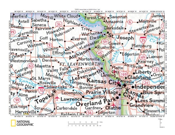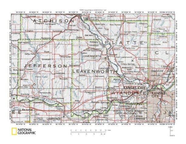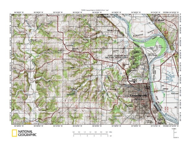 Figure 7: Stranger Creek-Missouri River drainage divide area near Leavenworth. United States Geological Survey map digitally presented using National Geographic Society TOPO software.