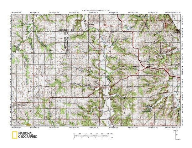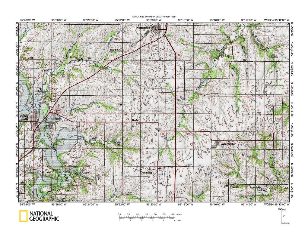 Figure 3: Delaware River-Crooked Creek drainage divide area south of Nortonville. United States Geological Survey map digitally presented using National Geographic Society TOPO software.