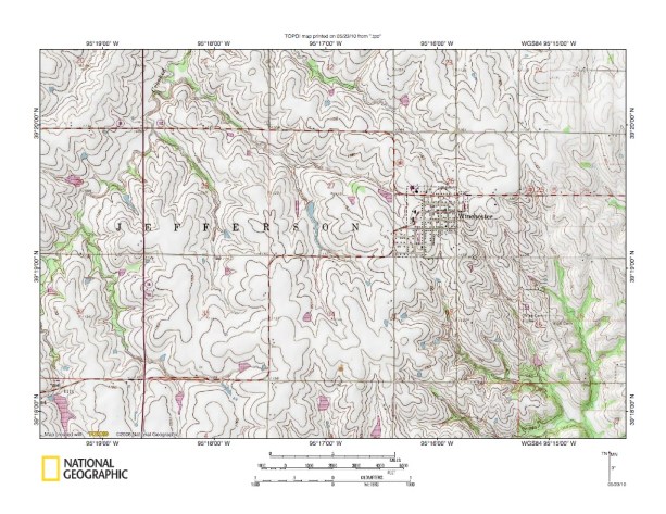 Figure 10: Slough Creek-Buck Creek drainage divide area near Oskaloosa. United States Geological Survey map digitally presented using National Geographic Society TOPO software.