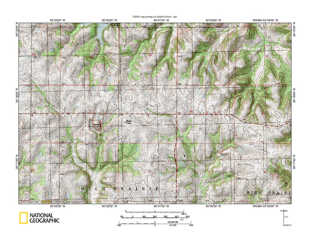 Figure 9: Missouri River-Kansas River drainage divide area in Wyandotte County. United States Geological Survey map digitally presented using National Geographic Society TOPO software.
