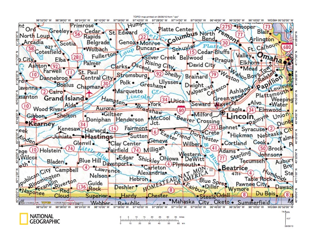 Figure 6: Lincoln Creek-Beaver Creek drainage divide area east of York. United States Geological Survey map digitally presented using National Geographic Society TOPO software.