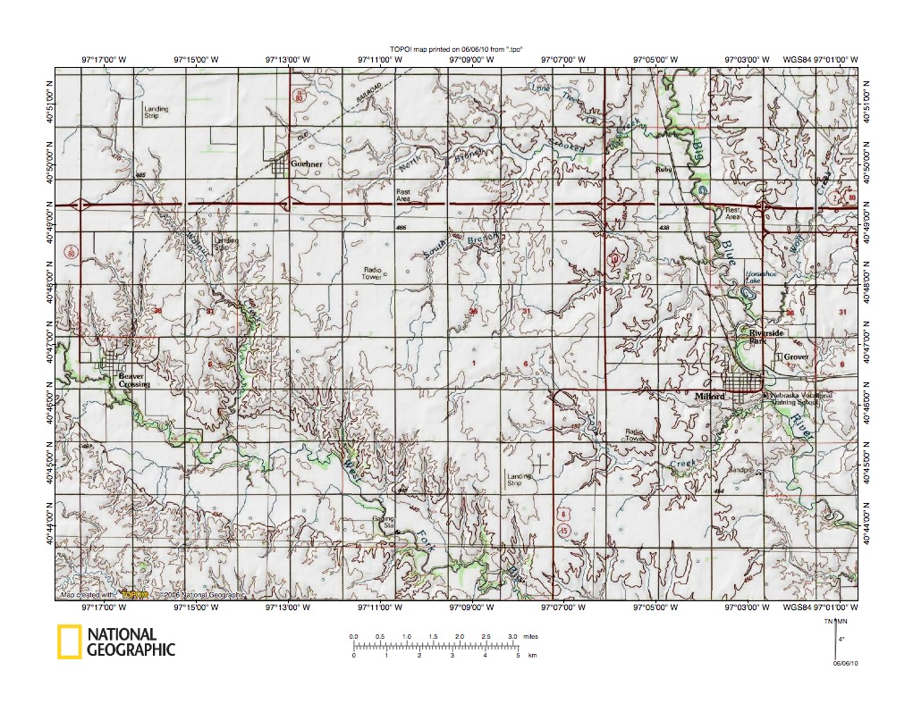 Figure 8: Beaver Creek-West Fork Big Blue River drainage divide area. United States Geological Survey map digitally presented using National Geographic Society TOPO software.