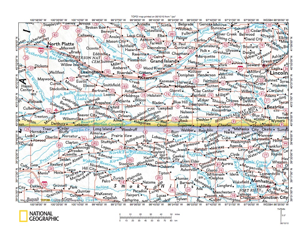 Figure 1: Little Blue River-Republican River drainage divide area location map(select and click on maps to enlarge). National Geographic Society map digitally presented using National Geographic Society TOPO software.