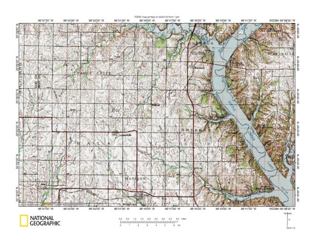 Figure 1: Mill Creek (Big Blue River)-Republican River (Kansas River) drainage divide area location map (select and click on maps to enlarge). National Geographic Society map digitally presented using National Geographic Society TOPO software.