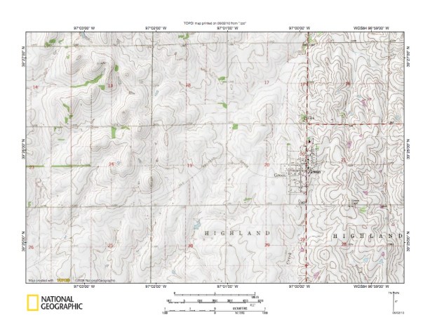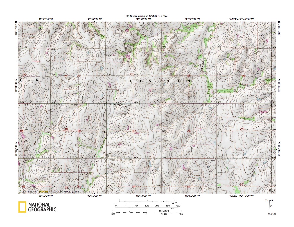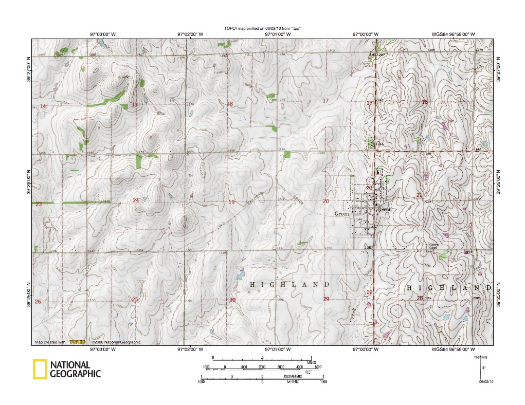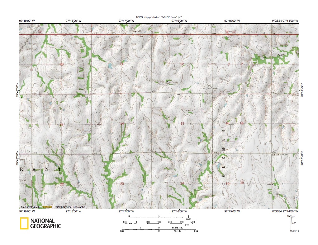 Figure 9a: Detailed map of West Fancy Creek-Republican River drainage divide area near Green, Kansas. United States Geological Survey map digitally presented using National Geographic Society TOPO software.