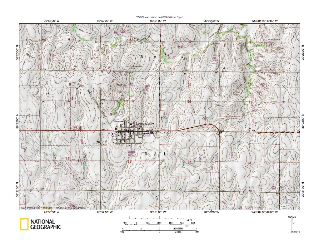 Figure 10a: Detailed map of Walnut Creek-Mill Creek drainage divide area near Leonardville, Kansas. United States Geological Survey map digitally presented using National Geographic Society TOPO software.