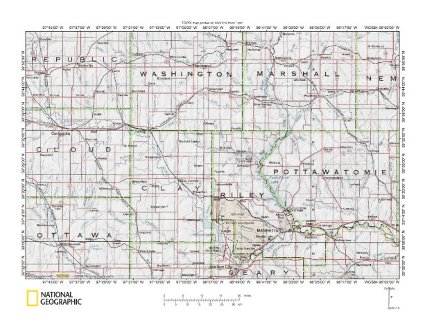 Figure 10: Fancy Creek-Wildcat Creek drainage divide area near Tuttle Creek Lake. United States Geological Survey map digitally presented using National Geographic Society TOPO software.