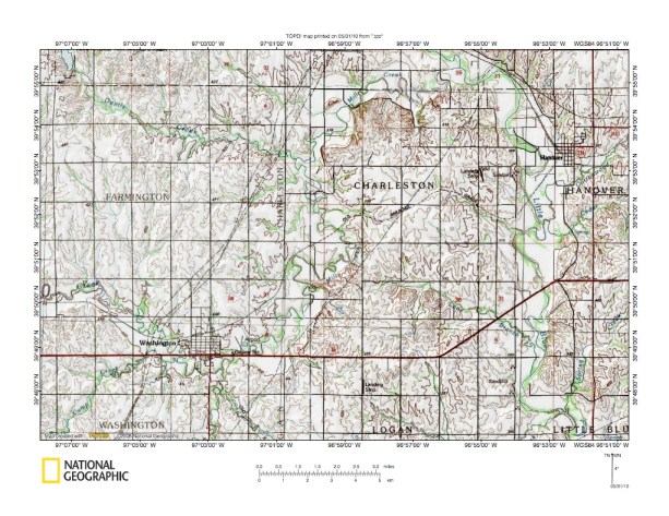 Figure 5: Mill Creek-Little Blue River drainage divide area east of Washington, Kansas. United States Geological Survey map digitally presented using National Geographic Society TOPO software.