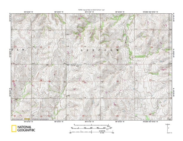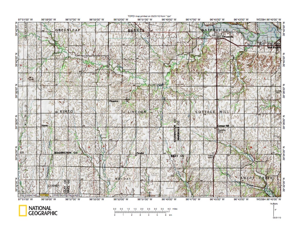 Figure 7: Coon Creek-Fancy Creek drainage divide area southwest of Waterville, Kansas. United States Geological Survey map digitally presented using National Geographic Society TOPO software.