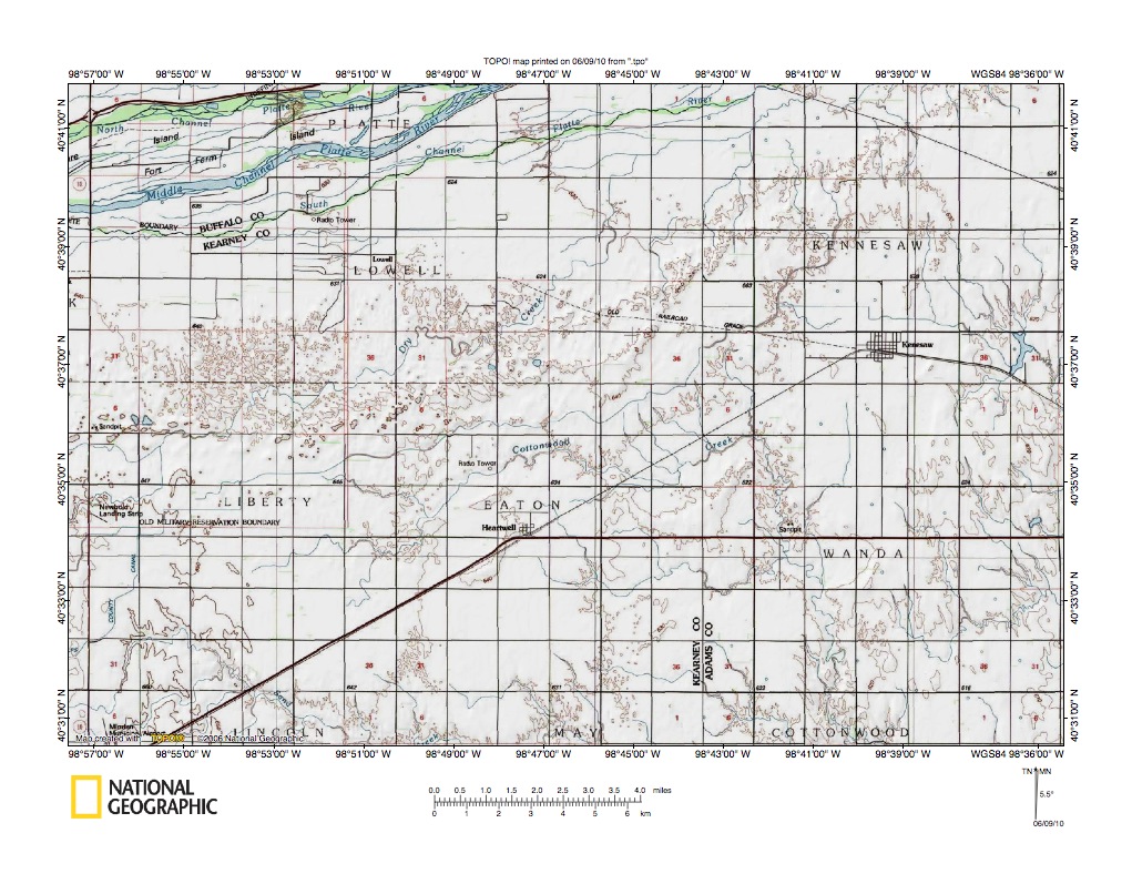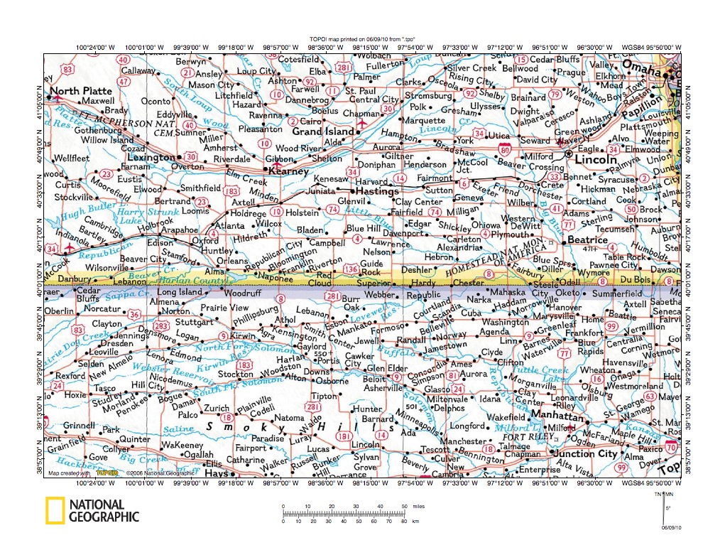 Figure 1: Platte River-Little Blue River drainage divide area location map (select and click on maps to enlarge). National Geographic Society map digitally presented using National Geographic Society TOPO software.