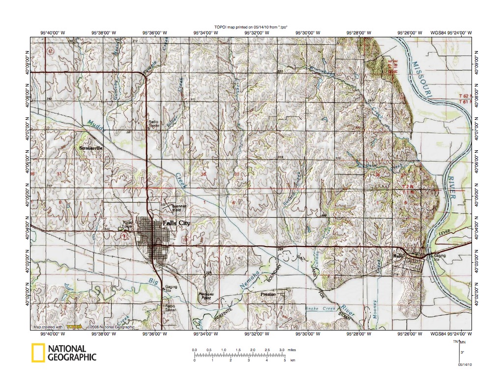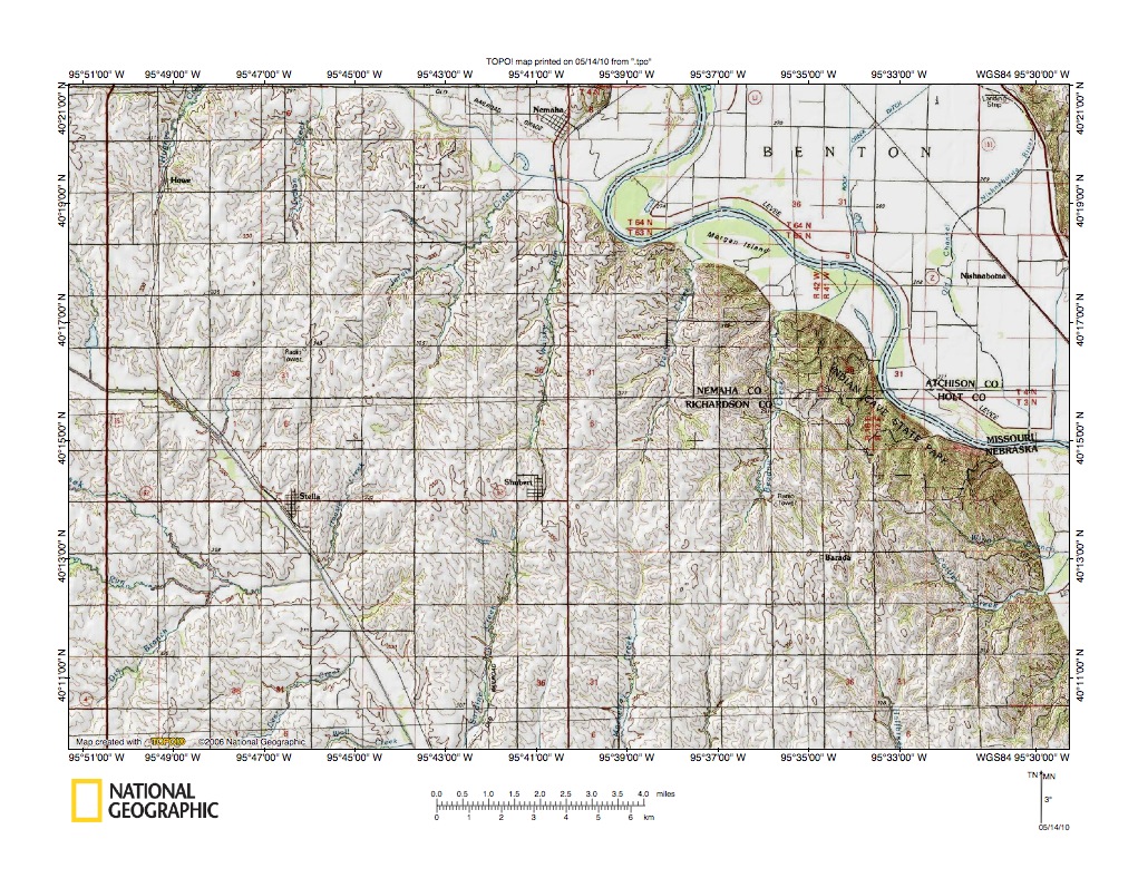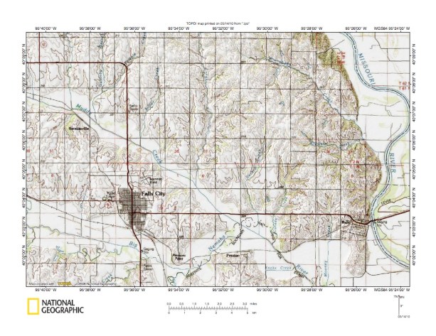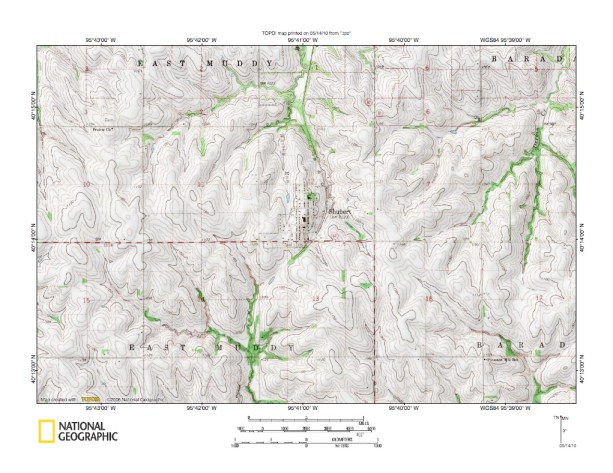 Figure 9a: Muddy Creek-Big Nemaha Creek drainage divide area near Missouri River. United States Geological Survey map digitally presented using National Geographic Society TOPO software.