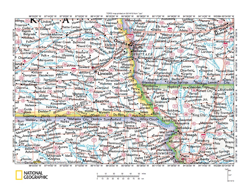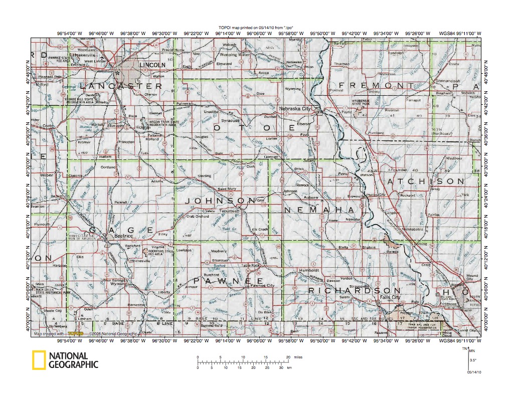 Figure 1: Little Nemaha River-Big Nemaha River drainage divide area location map. National Geographic Society map digitally presented using National Geographic Society TOPO software.