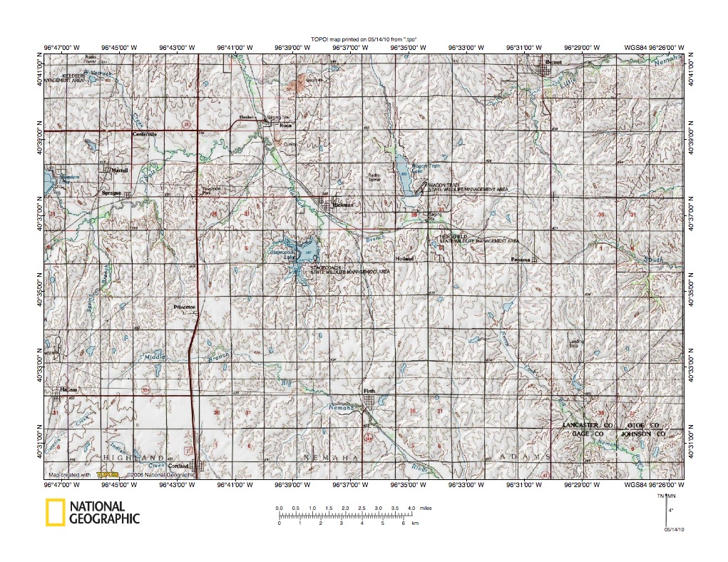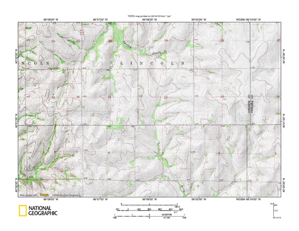 Figure 3: Salt Creek-Big Nemaha River drainage divide area. United States Geological Survey map digitally presented using National Geographic Society TOPO software.