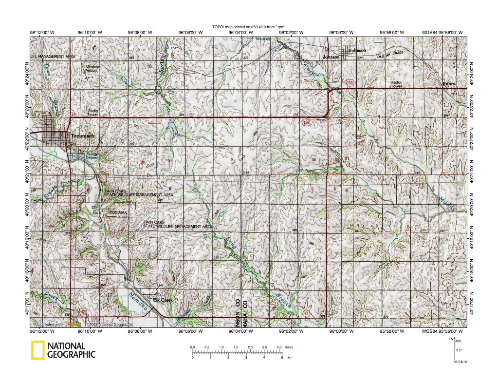Figure 10: Detailed map of Little Nemaha River-Muddy Creek drainage divide area. United States Geological Survey map digitally presented using National Geographic Society TOPO software.