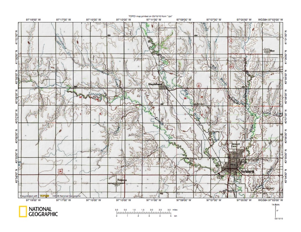 Figure 10: Big Blue River tributary drainage divides northwest of Seward. United States Geological Survey map digitally presented using National Geographic Society TOPO software.